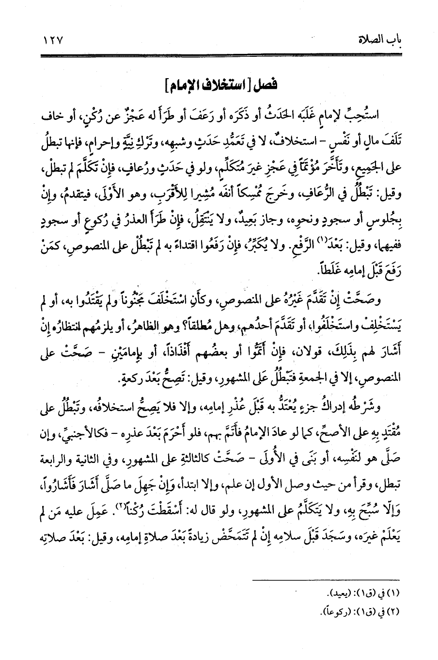 استُحِبِّ لإمامٍ غَلَبَه الحَدَثُ أو ذَكَرَه أو رَعَفَ أو طَرَأَ له عَجْزٌ عن رُكْنٍ، أو خاف تَلَفَ مالٍ أو نَفْسٍ - استخلافٌ، لا في تَعَمُّدِ حَدَثٍ وشبهِه، وتَرْكِ نِيَّةٍ وإحرامٍ، فإنها تبطلُ على الجَمِيعِ، وتَأَخَّرَ مُؤْتَمّاً فِي عَجْزِ غيرَ مُتَكَلِّمٍ، ولو في حَدَثٍ ورُعافٍ، فإِنْ تَكَلَّمَ لم تبطلْ، وقيل: تَبْطُلُ في الرُّعَافِ، وخَرجَ مُمْسِكاً أنفَه مُشِيرا لِلأَقْرَبِ، وهو الأَوْلَى، فيتقدمُ، وإِنْ بِجُلوسٍ أو سجودٍ ونحوِه، وجاز بَعِيدٌ، ولا يَنْتَقِلُ، فإِنْ طَرَأَ العذرُ في رُكوعٍ أو سجودٍ ففيهما، وقيل: بَعْدَ (¬1) الرَّفْعِ. ولا يُكَبِّرُ، فإِنْ رَفَعُوا اقتداءً به لم تَبْطُلْ على المنصوصِ، كمَنْ رَفَعَ قَبْلَ إمامِه غَلَطاً.