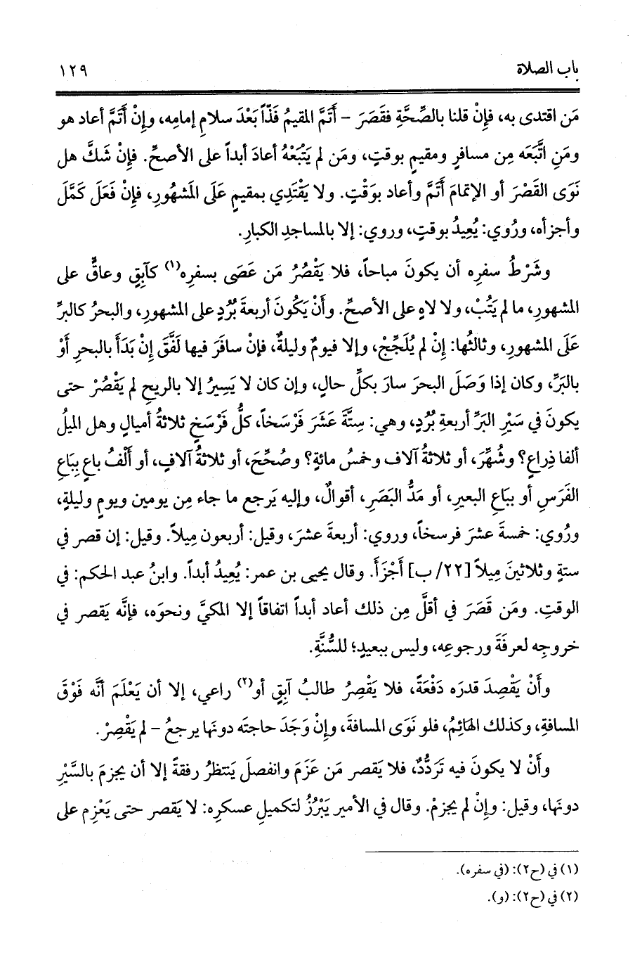 وشَرْطُ سفرِه أن يكونَ مباحاً، فلا يَقْصُرُ مَن عَصَى بسفرِه (¬1) كآبِقٍ وعاقٍّ على المشهورِ، ما لم يَتُبْ، ولا لاهٍ على الأصحِّ. وأَنْ يَكُونَ أربعةَ بُرُدٍ على المشهورِ، والبحرُ كالبرِّ عَلَى المشهورِ، وثالثُها: إِنْ لم يُلَجِّجْ، وإلا فيومٌ وليلةٌ، فإنْ سافَرَ فيها لَفَّقَ إِنْ بَدَأَ بالبحرِ أَوْ بالبَرِّ، وكان إذا وَصَلَ البحرَ سارَ بكلِّ حالٍ، وإن كان لا يَسِيرُ إلا بالريحِ لم يَقْصُرْ حتى يكونَ في سَيْرِ البَرِّ أربعةِ بُرُدٍ، وهي: سِتَّةَ عَشَرَ فَرْسَخاً، كلُّ فَرْسَخٍ ثلاثةُ أميالٍ وهل الميلُ ألفا ذِراعٍ؟ وشُهِّرَ، أو ثلاثةُ آلاف وخمسُ مائةٍ؟ وصُحِّحَ، أو ثلاثةُ آلافٍ، أو أَلْفُ باعٍ بِبَاعِ الفَرَسِ أو ببَاعِ البعيرِ، أو مَدُّ البَصَرِ، أقوالٌ، وإليه يَرجع ما جاء مِن يومين ويومٍ وليلةٍ، ورُوي: خمسةَ عشرَ فرسخاً، وروي: أربعةَ عشرَ، وقيل: أربعون مِيلاً. وقيل: إن قصر في ستةٍ وثلاثينَ مِيلاً [22/ب] أَجْزَأَ. وقال يحيى بن عمر: يُعِيدُ أبداً. وابنُ عبد الحكم: في الوقتِ. ومَن قَصَرَ في أقلَّ مِن ذلك أعاد أبداً اتفاقاً إلا المكيَّ ونحوَه، فإنَّه يَقصر في خروجِه لعرفَةَ ورجوعِه، وليس ببعيدٍ؛ للسُّنَّةِ.