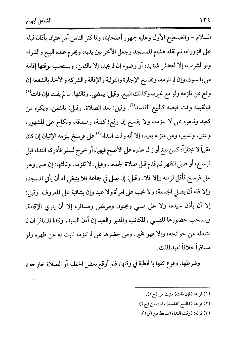 السلام - والصحيح الأول وعليه جمهور أصحابنا، ولما كثر الناس أمر عثمان بأذان قبله على الزوراء، ثم نقله هشام للمسجد وجعل الآخر بين يديه، ويحرم عنده البيع والشراء ولو لشرب، إلا لعطش شديد، أو وضوء إن لم يجده إلا بالثمن، ويستحب بوقتها إقامة من بالسوق وإن لم تلزمه، وتفسخ الإجارة والتولية والإقالة والشركة والأخذ بالشفعة إن وقع ممن تلزمه ولو مع غيره، وكذلك البيع. وقيل: يمضي. وثالثها: ما لم يفت فإن فات (¬1) فبالقيمة وقت قبضه كالبيع الفاسد (¬2). وقيل: بعد الصلاة. وقيل: بالثمن. ويكره من كعبد ونحوه ممن لا تلزمه، ولا يفسخ إن وقع؛ كهبة، وصدقة، ونكاح على المشهور، وعتق، وتدبير، ومن منزله بعيد، إلا أنه وقت النداء (¬3) على فرسخ يلزمه الإتيان إن كان مقيماً لا مجتازاً؛ كمن بلغ أو زال عذره على الأصح فيهما، أو خرج لسفر فأدركه النداء قبل فرسخ، أو صلى الظهر ثم قدم قبل صلاة الجمعة. وقيل: لا تلزمه. وثالثها: إن صلى وهو على فرسخ فأقل لزمته وإلا فلا.