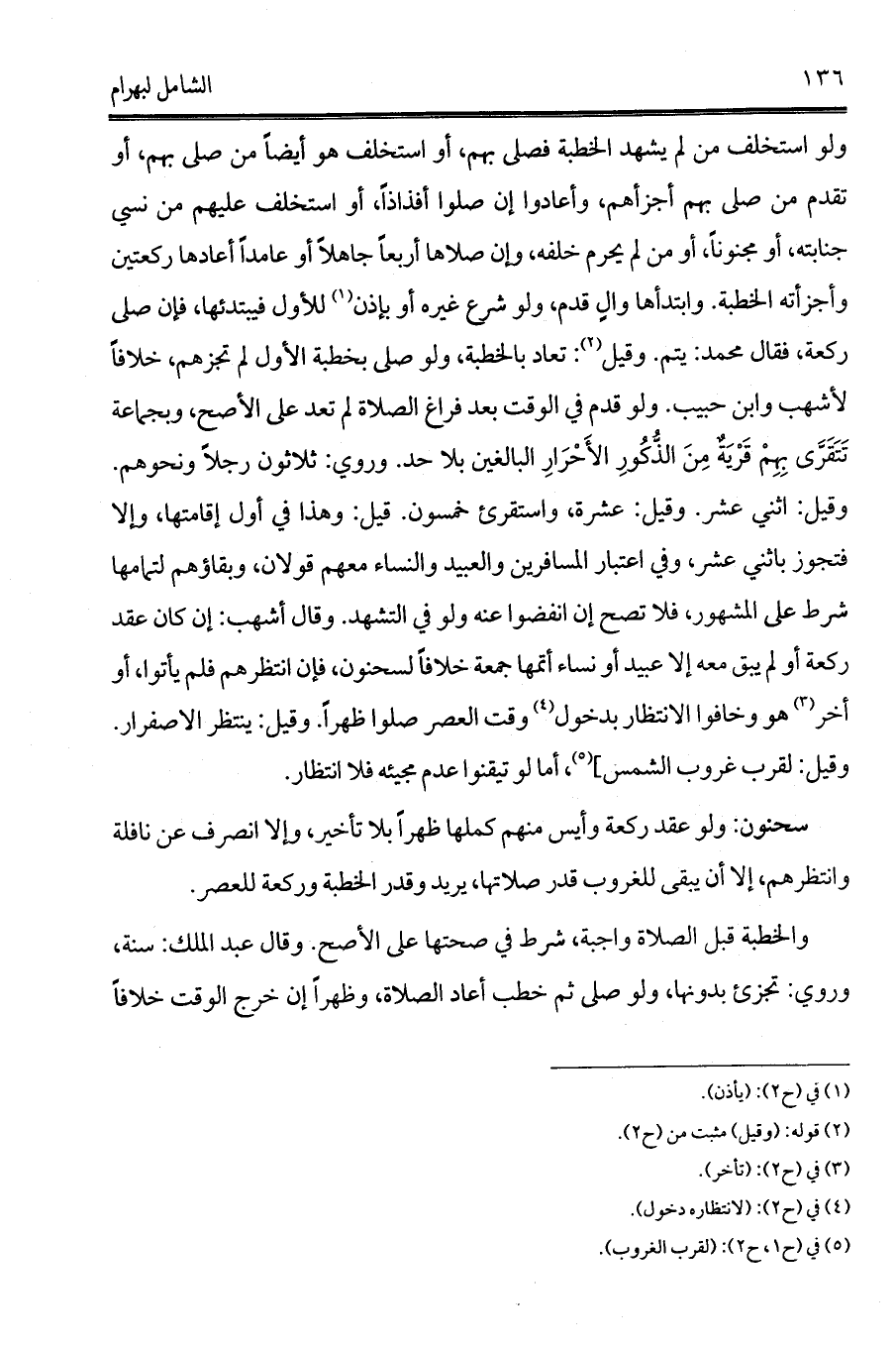 ولو استخلف من لم يشهد الخطبة فصلى بهم، أو استخلف هو أيضاً من صلى بهم، أو تقدم من صلى بهم أجزأهم، وأعادوا إن صلوا أفذاذاً، أو استخلف عليهم من نسي جنابته، أو مجنوناً، أو من لم يحرم خلفه، وإن صلاها أربعاً جاهلاً أو عامداً أعادها ركعتين وأجزأته الخطبة. وابتدأها والٍ قدم، ولو شرع غيره أو بإذن (¬1) للأول فيبتدئها، فإن صلى ركعة، فقال محمد: يتم. وقيل (¬2): تعاد بالخطبة، ولو صلى بخطبة الأول لم تجزهم، خلافاً لأشهب وابن حبيب. ولو قدم في الوقت بعد فراغ الصلاة لم تعد على الأصح، وبجماعة تَتَقَرَّى بِهِمْ قَرْيَةٌ مِنَ الذُّكُورِ الأَحْرَارِ البالغين بلا حد. وروي: ثلاثون رجلاً ونحوهم. وقيل: اثني عشر. وقيل: عشرة، واستقرئ خمسون. قيل: وهذا في أول إقامتها، وإلا فتجوز باثني عشر، وفي اعتبار المسافرين والعبيد والنساء معهم قولان، وبقاؤهم لتمامها شرط على المشهور، فلا تصح إن انفضوا عنه ولو في التشهد.