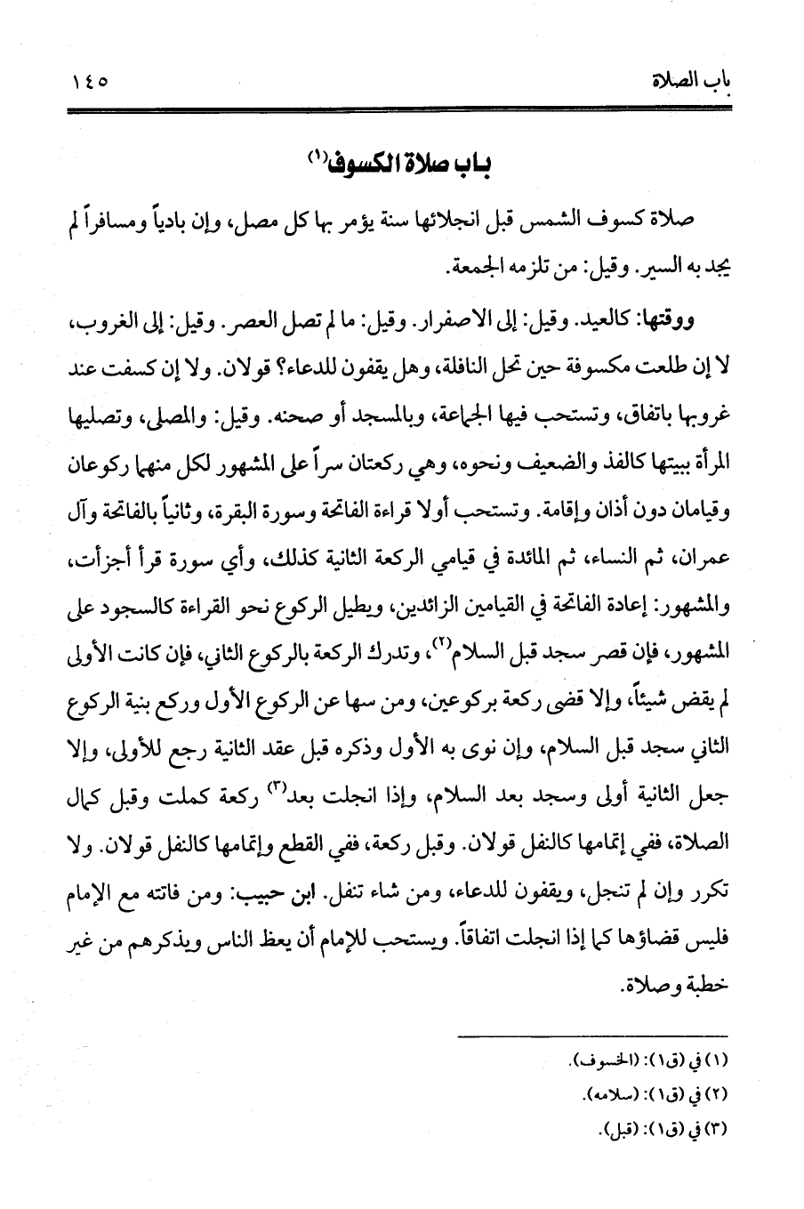 صلاة كسوف الشمس قبل انجلائها سنة يؤمر بها كل مصل، وإن بادياً ومسافراً لم يجد به السير. وقيل: من تلزمه الجمعة.