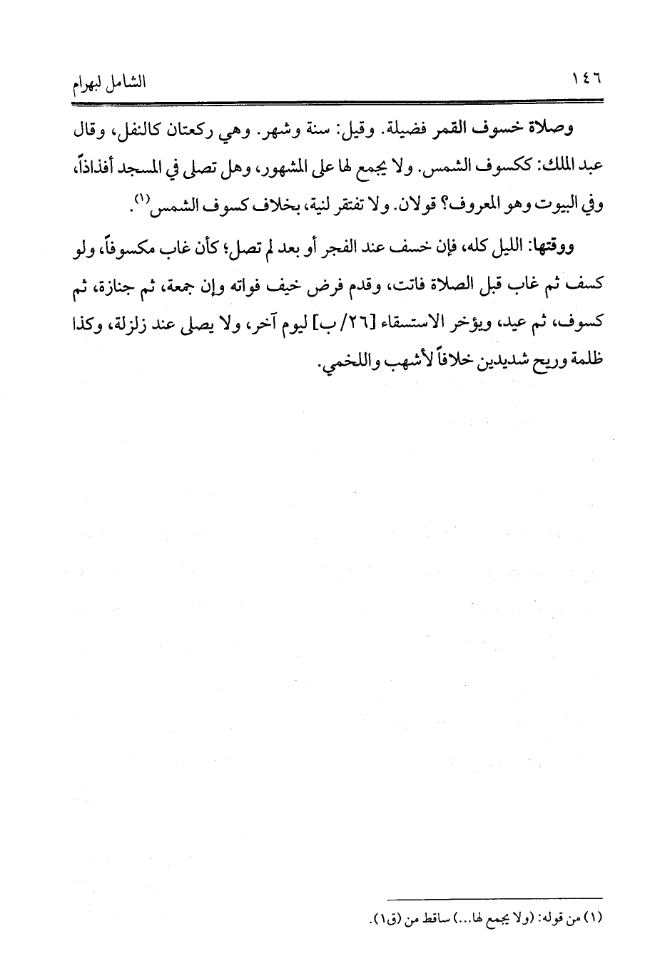 وصلاة خسوف القمر فضيلة. وقيل: سنة وشهر. وهي ركعتان كالنفل، وقال عبد الملك: ككسوف الشمس. ولا يجمع لها على المشهور، وهل تصلى في المسجد أفذاذاً، وفي البيوت وهو المعروف؟ قولان. ولا تفتقر لنية، بخلاف كسوف الشمس (¬1).