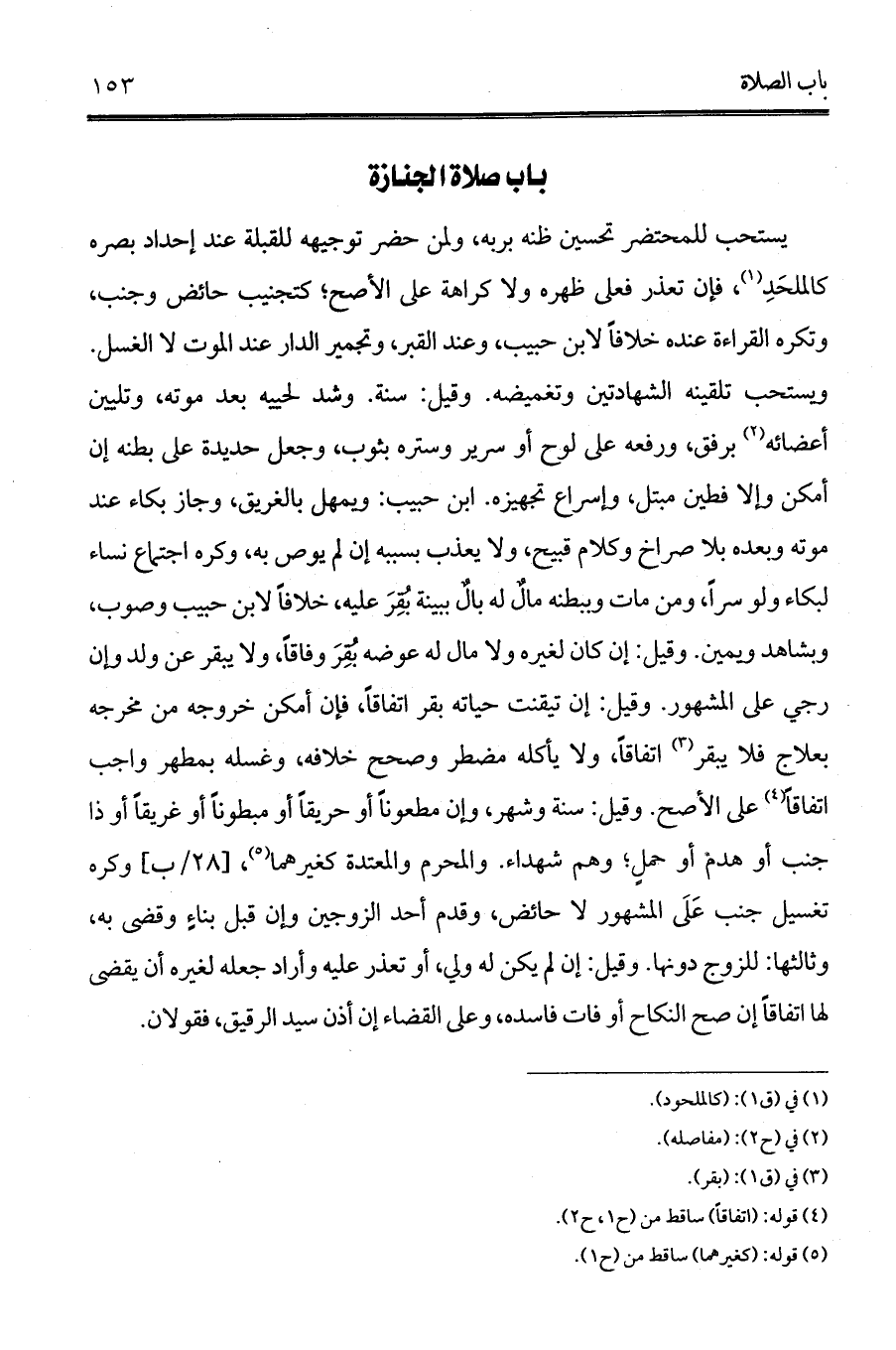 يستحب للمحتضر تحسين ظنه بربه، ولمن حضر توجيهه للقبلة عند إحداد بصره كالملحَدِ (¬1)، فإن تعذر فعلى ظهره ولا كراهة على الأصح؛ كتجنيب حائض وجنب، وتكره القراءة عنده خلافاً لابن حبيب، وعند القبر، وتجمير الدار عند الموت لا الغسل. ويستحب تلقينه الشهادتين وتغميضه. وقيل: سنة. وشد لحييه بعد موته، وتليين أعضائه (¬2) برفق، ورفعه على لوح أو سرير وستره بثوب، وجعل حديدة على بطنه إن أمكن وإلا فطين مبتل، وإسراع تجهيزه. ابن حبيب: ويمهل بالغريق، وجاز بكاء عند موته وبعده بلا صراخ وكلام قبيح، ولا يعذب بسببه إن لم يوص به، وكره اجتماع نساء لبكاء ولو سراً، ومن مات وببطنه مالٌ له بالٌ ببينة بُقِرَ عليه، خلافاً لابن حبيب ولصوب، وبشاهد ويمين. وقيل: إن كان لغيره ولا مال له عوضه بُقِرَ وفاقاً، ولا يبقر عن ولد وإن رجي على المشهور. وقيل: إن تيقنت حياته بقر اتفاقاً، فإن أمكن خروجه من مخرجه بعلاج فلا يبقر (¬3) اتفاقاً، ولا يأكله مضطر وصحح خلافه، وغسله بمطهر واجب اتفاقاً (¬4) على الأصح. وقيل: سنة وشهر، وإن مطعوناً أو حريقاً أو مبطوناً أو غريقاً أو ذا جنب أو هدم أو حملٍ؛ وهم شهداء. والمحرم والمعتدة كغيرهما (¬5)، [28/ب] وكره تغسيل جنب عَلَى المشهور لا حائض، وقدم أحد الزوجين وإن قبل بناءٍ وقضى به، وثالثها: للزوج دونها. وقيل: إن لم يكن له ولي، أو تعذر عليه وأراد جعله لغيره أن يقضى لها اتفاقاً إن صح النكاح أو فات فاسده، وعلى القضاء إن أذن سيد الرقيق، فقولان.