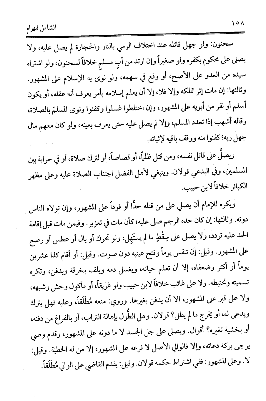 سحنون: ولو جهل قاتله عند اختلاف الرمي بالنار والحجارة لم يصل عليه، ولا يصلى على محكوم بكفره ولو صغيراً وإن ارتد من أبٍ مسلمٍ خلافاً لسحنون، ولو اشتراه سيده من العدو على الأصح، أو وقع في سهمه، ولو نوى به الإسلام على المشهور. وثالثها: إن مات إثر تملكه وإلا فلا، إلا أن يعلم إسلامه بأمر يعرف أنه عقله، أو يكون أسلم أو نفر من أبويه على المشهور، وإن اختلطوا غسلوا وكفنوا ونوى المسلمَ بالصلاة، وقاله أشهب إذا تعدد المسلم، وإلا لم يصل عليه حتى يعرف بعينه، ولو كان معهم مال جهل ربه؛ كفنوا منه ووقف باقيه لإثباته.