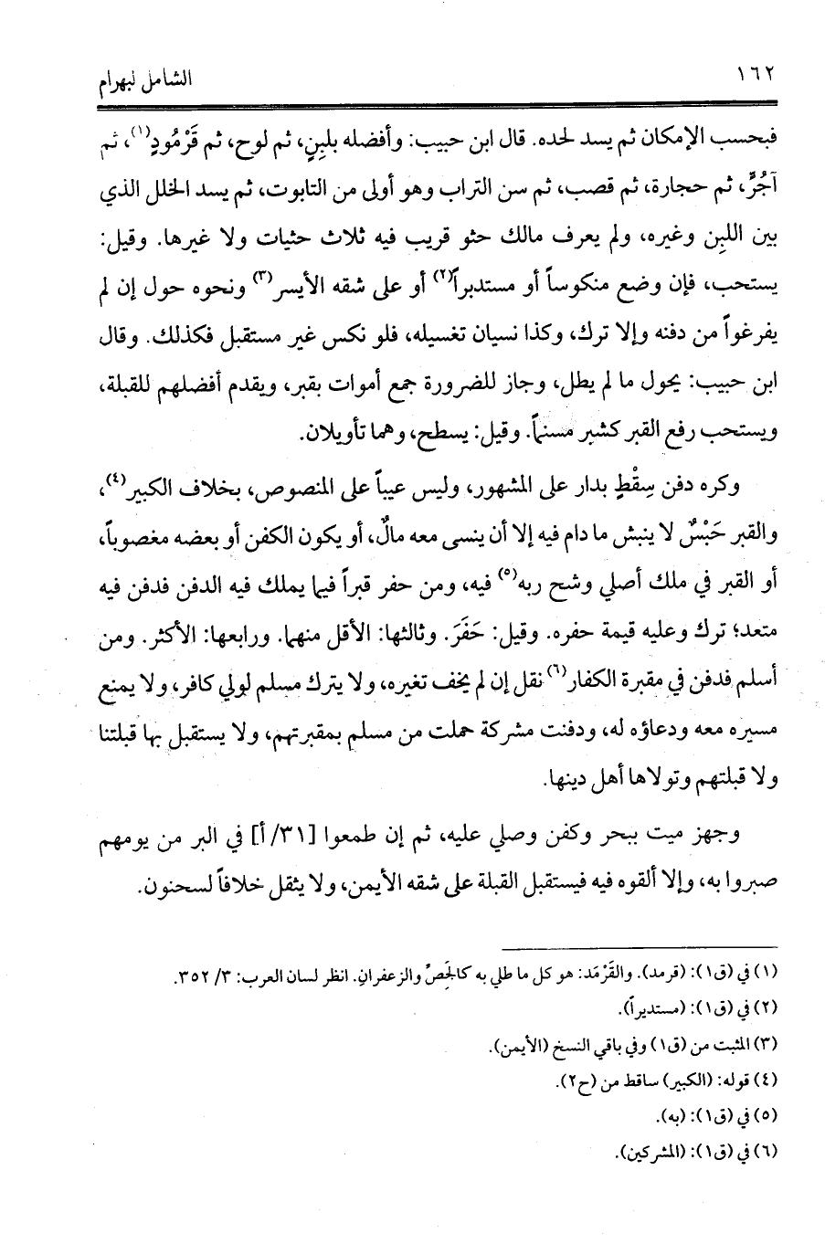 وكره دفن سِقْطٍ بدار على المشهور، وليس عيباً على المنصوص، بخلاف الكبير (¬4)، والقبر حَبْسٌ لا ينبش ما دام فيه إلا أن ينسى معه مالٌ، أو يكون الكفن أو بعضه مغصوباً، أو القبر في ملك أصلي وشح ربه (¬5) فيه، ومن حفر قبراً فيما يملك فيه الدفن فدفن فيه متعد؛ ترك وعليه قيمة حفره. وقيل: حَفَرَ. وثالثها: الأقل منهما. ورابعها: الأكثر. ومن أسلم فدفن في مقبرة الكفار (¬6) نقل إن لم يخف تغيره، ولا يترك مسلم لولي كافر، ولا يمنع مسيره معه ودعاؤه له، ودفنت مشركة حملت من مسلم بمقبرتهم، ولا يستقبل بها قبلتنا ولا قبلتهم وتولاها أهل دينها.