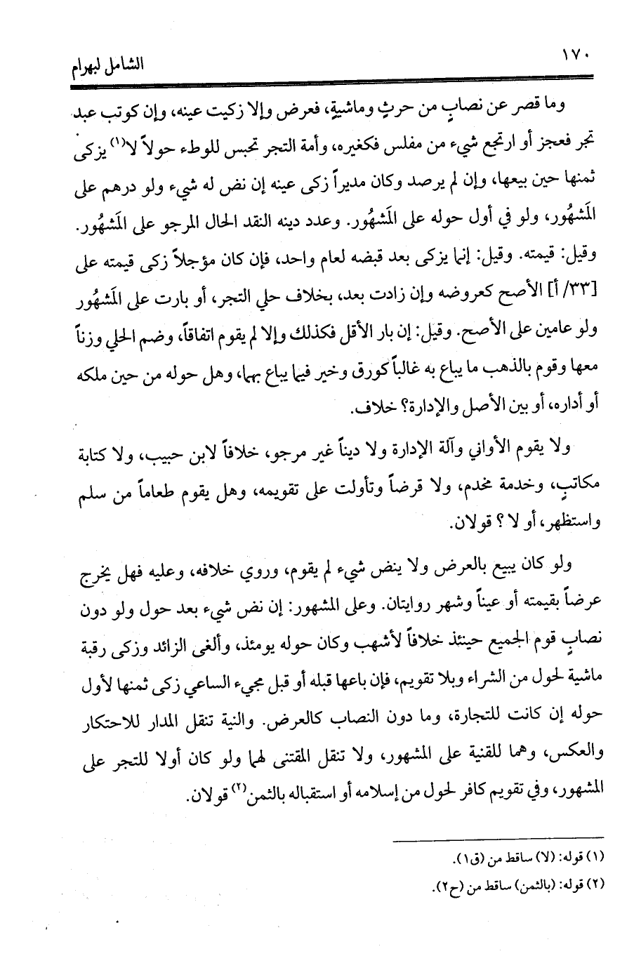ولو كان يبيع بالعرض ولا ينض شيء لم يقوم، وروي خلافه، وعليه فهل يخرج عرضاً بقيمته أو عيناً وشهر روايتان. وعلى المشهور: إن نض شيء بعد حول ولو دون نصابٍ قوم الجميع حينئذ خلافاً لأشهب وكان حوله يومئذ، وألغى الزائد وزكى رقبة ماشية لحول من الشراء وبلا تقويم, فإن باعها قبله أو قبل مجيء الساعي زكى ثمنها لأول حوله إن كانت للتجارة، وما دون النصاب كالعرض. والنية تنقل المدار للاحتكار والعكس، وهما للقنية على المشهور، ولا تنقل المقتنى لهما ولو كان أولا للتجر على المشهور، وفي تقويم كافر لحول من إسلامه أو استقباله بالثمن (¬2) قولان.