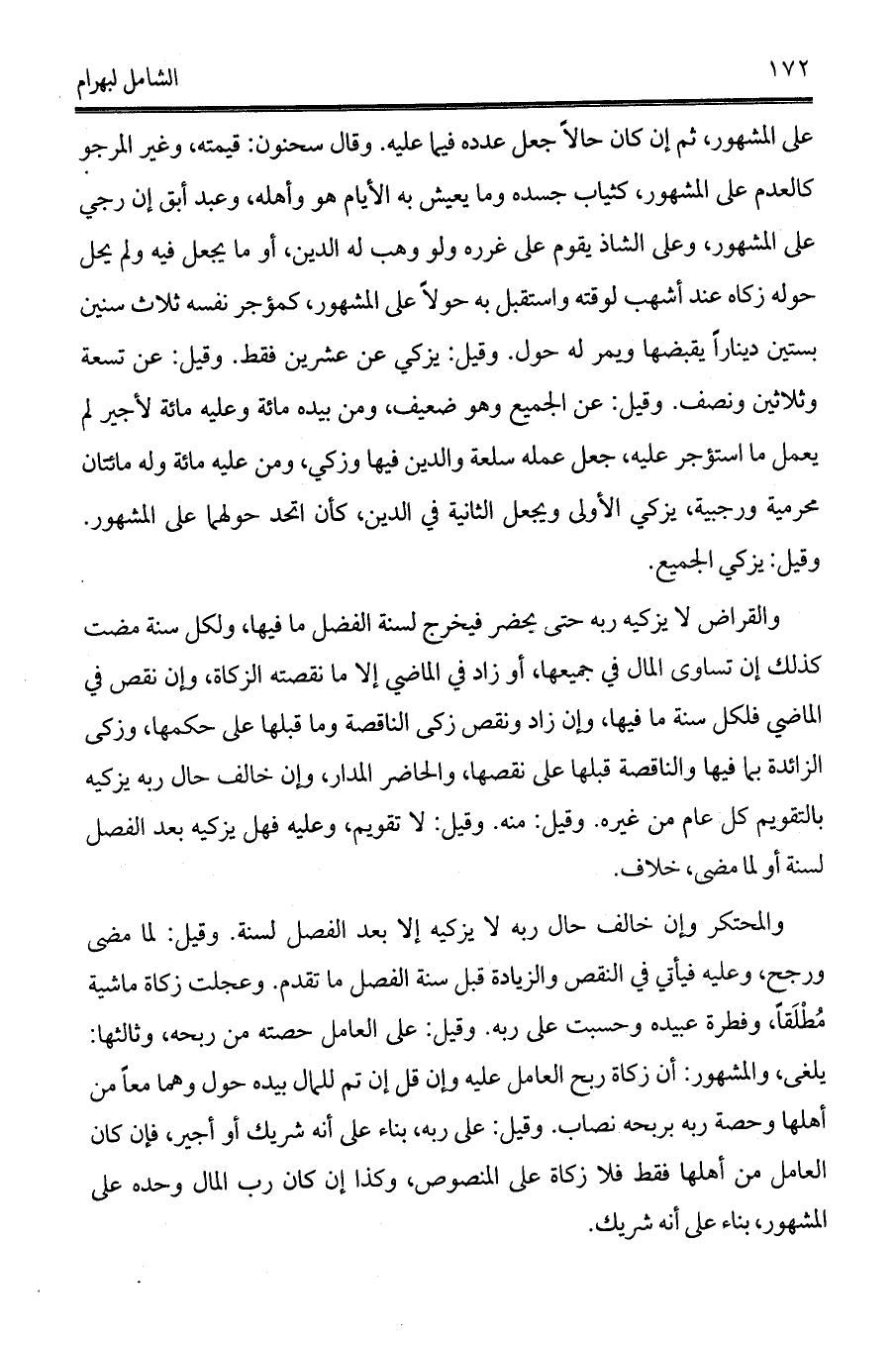 على المشهور، ثم إن كان حالاً جعل عدده فيما عليه. وقال سحنون: قيمته، وغير المرجو كالعدم على المشهور, كثياب جسده وما يعيش به الأيام هو وأهله، وعبد أبق إن رجي على المشهور، وعلى الشاذ يقوم على غرره ولو وهب له الدين، أو ما يجعل فيه ولم يحل حوله زكاه عند أشهب لوقته واستقبل به حولاً على المشهور، كمؤجر نفسه ثلاث سنين بستين ديناراً يقبضها ويمر له حول. وقيل: يزكي عن عشرين فقط. وقيل: عن تسعة وثلاثين ونصف.