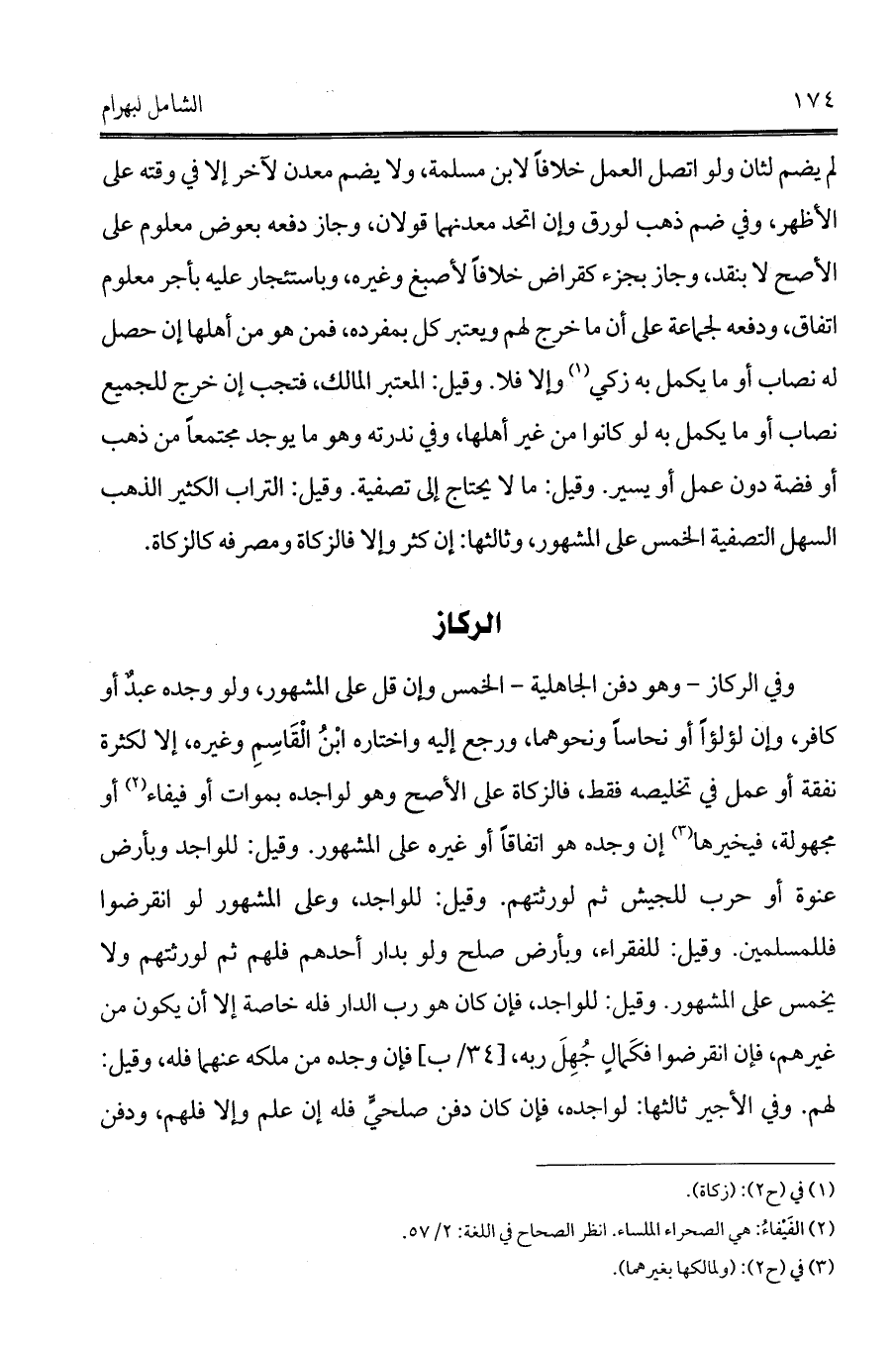 وفي الركاز - وهو دفن الجاهلية - الخمس وإن قل على المشهور، ولو وجده عبدٌ أو كافر، وإن لؤلؤاً أو نحاساً ونحوهما، ورجع إليه واختاره ابْنُ الْقَاسِمِ وغيره، إلا لكثرة نفقة أو عمل في تخليصه فقط, فالزكاة على الأصح وهو لواجده بموات أو فيفاء (¬2) أو مجهولة، فيخيرها (¬3) إن وجده هو اتفاقاً أو غيره على المشهور. وقيل: للواجد وبأرض عنوة أو حرب للجيش ثم لورثتهم. وقيل: للواجد، وعلى المشهور لو انقرضوا فللمسلمين. وقيل: للفقراء، وبأرض صلح ولو بدار أحدهم فلهم ثم لورثتهم ولا يخمس على المشهور. وقيل: للواجد, فإن كان هو رب الدار فله خاصة إلا أن يكون من غيرهم، فإن انقرضوا فكَمالٍ جُهِلَ ربه، [34/ب] فإن وجده من ملكه عنهما فله، وقيل: لهم. وفي الأجير ثالثها: لواجده، فإن كان دفن صلحيٍّ فله إن علم وإلا فلهم، ودفن