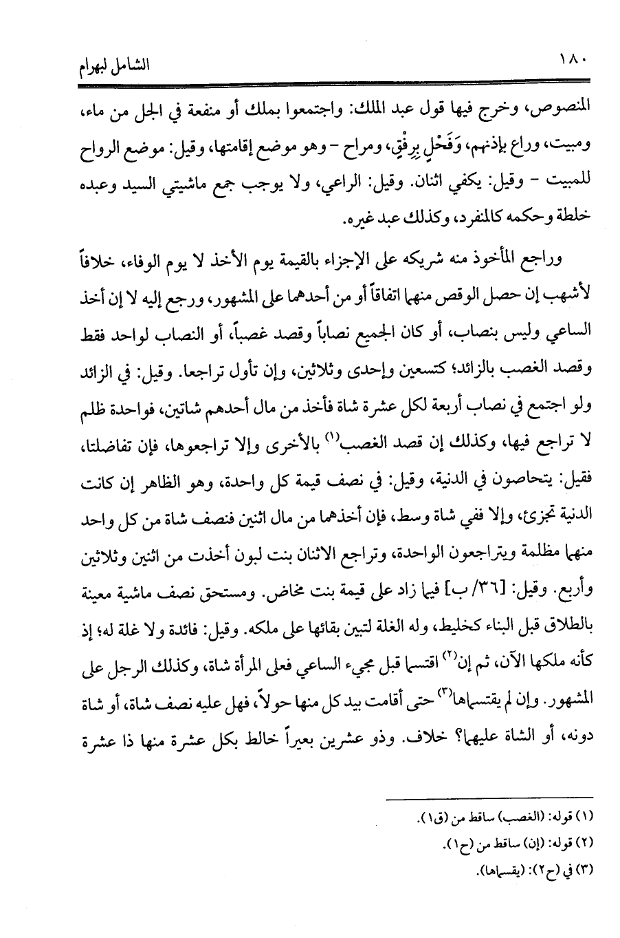 المنصوص، وخرج فيها قول عبد الملك: واجتمعوا بملك أو منفعة في الجل من ماء, ومبيت, وراع بإذنهم, وَفَحْلٍ بِرِفْقٍ, ومراح - وهو موضع إقامتها، وقيل: موضع الرواح للمبيت - وقيل: يكفي اثنان. وقيل: الراعي، ولا يوجب جمع ماشيتي السيد وعبده خلطة وحكمه كالمنفرد، وكذلك عبد غيره.