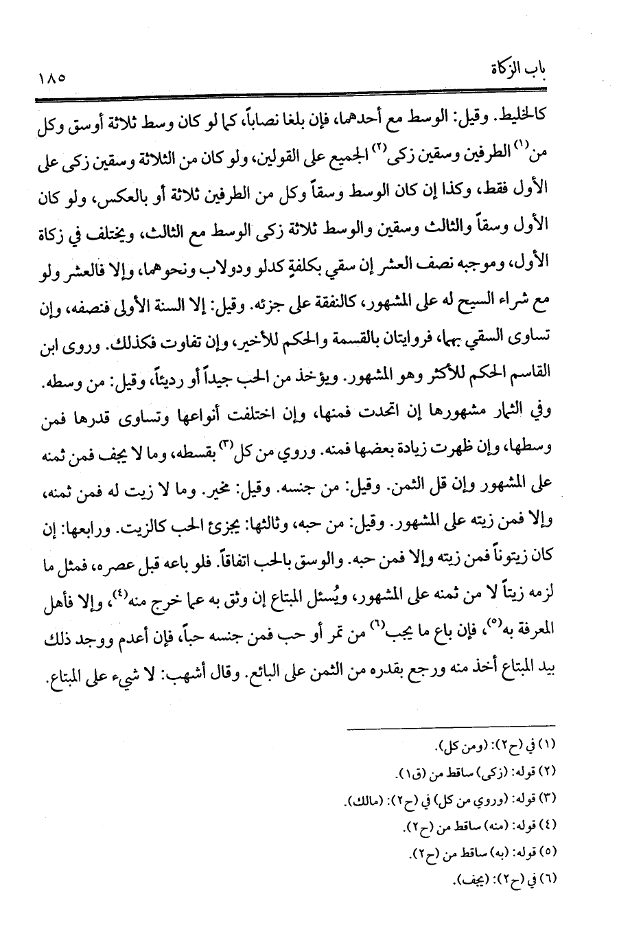 كالخليط. وقيل: الوسط مع أحدهما، فإن بلغا نصاباً، كما لو كان وسط ثلاثة أوسق وكل من (¬1) الطرفين وسقين زكى (¬2) الجميع على القولين، ولو كان من الثلاثة وسقين زكى على الأول فقط، وكذا إن كان الوسط وسقاً وكل من الطرفين ثلاثة أو بالعكس، ولو كان الأول وسقاً والثالث وسقين والوسط ثلاثة زكى الوسط مع الثالث، ويختلف في زكاة الأول، وموجبه نصف العشر إن سقي بكلفةٍ كدلو ودولاب ونحوهما، وإلا فالعشر ولو مع شراء السيح له على المشهور، كالنفقة على جزئه. وقيل: إلا السنة الأولى فنصفه، وإن تساوى السقي بهما، فروايتان بالقسمة والحكم للأخير، وإن تفاوت فكذلك. وروى ابن القاسم الحكم للأكثر وهو المشهور. ويؤخذ من الحب جيداً أو رديئاً، وقيل: من وسطه. وفي الثمار مشهورها إن اتحدت فمنها، وإن اختلفت أنواعها وتساوى قدرها فمن وسطها، وإن ظهرت زيادة بعضها فمنه. وروي من كل (¬3) بقسطه، وما لا يجف فمن ثمنه على المشهور وإن قل الثمن. وقيل: من جنسه. وقيل: مخير. وما لا زيت له فمن ثمنه، وإلا فمن زيته على المشهور. وقيل: من حبه، وثالثها: يجزئ الحب كالزيت. ورابعها: إن كان زيتوناً فمن زيته وإلا فمن حبه. والوسق بالحب اتفاقاً.