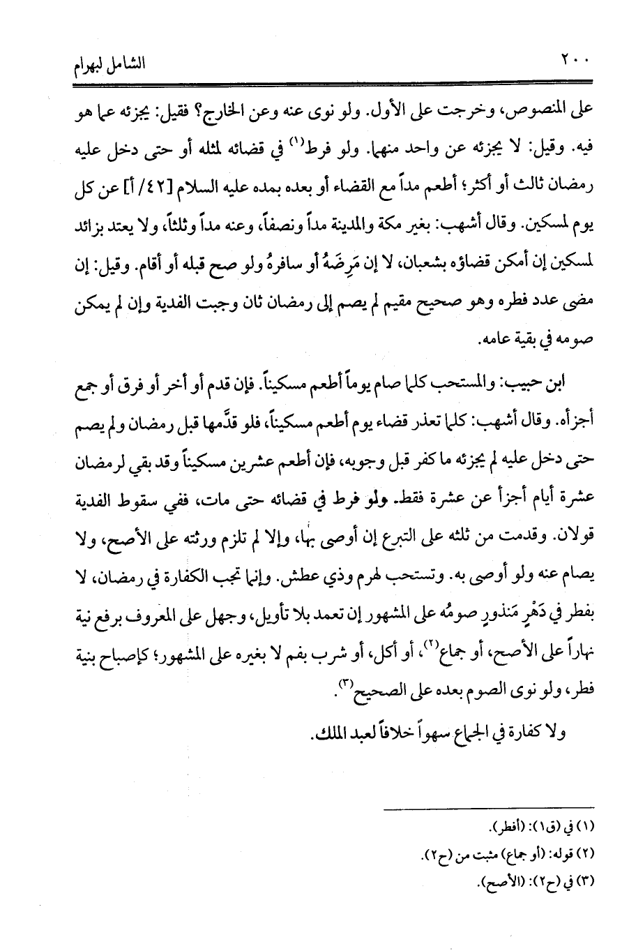 ابن حبيب: والمستحب كلما صام يوماً أطعم مسكيناً. فإن قدم أو أخر أو فرق أو جمع أجزأه. وقال أشهب: كلما تعذر قضاء يوم أطعم مسكيناً، فلو قدَّمها قبل رمضان ولم يصم حتى دخل عليه لم يجزئه ما كفر قبل وجوبه، فإن أطعم عشرين مسكيناً وقد بقي لرمضان عشرة أيام أجزأ عن عشرة فقط. ولو فرط في قضائه حتى مات، ففي سقوط الفدية قولان. وقدمت من ثلثه على التبرع إن أوصى بها، وإلا لم تلزم ورثته على الأصح، ولا يصام عنه ولو أوصى به. وتستحب لهرم وذي عطش. وإنما تجب الكفارة في رمضان, لا بفطر في دَهْرٍ مَنذورٍ صومُه على المشهور إن تعمد بلا تأويل, وجهل على المعروف برفع نية نهاراً على الأصح، أو جماع (¬2)، أو أكل, أو شرب بفم لا بغيره على المشهور؛ كإصباح بنية فطر، ولو نوى الصوم بعده على الصحيح (¬3).