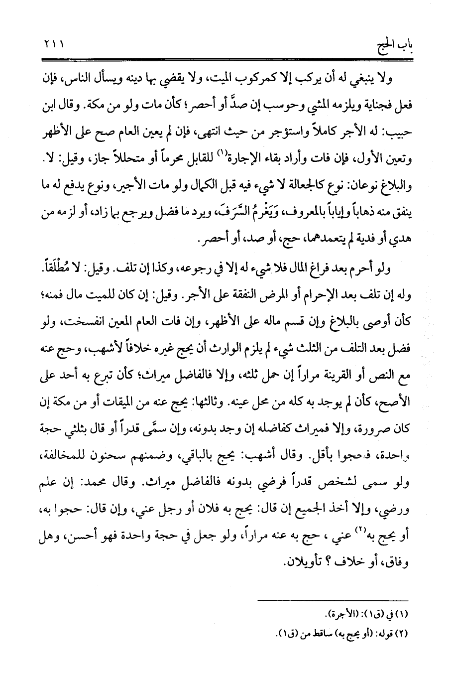 ولو أحرم بعد فراغ المال فلا شيء له إلا في رجوعه، وكذا إن تلف. وقيل: لا مُطْلَقاً. وله إن تلف بعد الإحرام أو المرض النفقة على الأجر. وقيل: إن كان للميت مال فمنه؛ كأن أوصى بالبلاغ وإن قسم ماله على الأظهر، وإن فات العام المعين انفسخت, ولو فضل بعد التلف من الثلث شيء لم يلزم الوارث أن يحج غيره خلافاً لأشهب، وحج عنه مع النص أو القرينة مراراً إن حمل ثلثه، وإلا فالفاضل ميراث؛ كأن تبرع به أحد على الأصح، كأن لم يوجد به كله من محل عينه. وثالثها: يحج عنه من الميقات أو من مكة إن كان صرورة، وإلا فميراث كفاضله إن وجد بدونه, وإن سمَّى قدراً أو قال بثلثي حجة واحدة، فحجوا بأقل. وقال أشهب: يحج بالباقي، وضمنهم سحنون للمخالفة، ولو سمى لشخص قدراً فرضي بدونه فالفاضل ميراث. وقال محمد: إن علم ورضي، وإلا أخذ الجميع إن قال: يحج به فلان أو رجل عني، وإن قال: حجوا به, أو يحج به (¬2) عني , حج به عنه مراراً، ولو جعل في حجة واحدة فهو أحسن، وهل وفاق, أو خلاف؟ تأويلان.