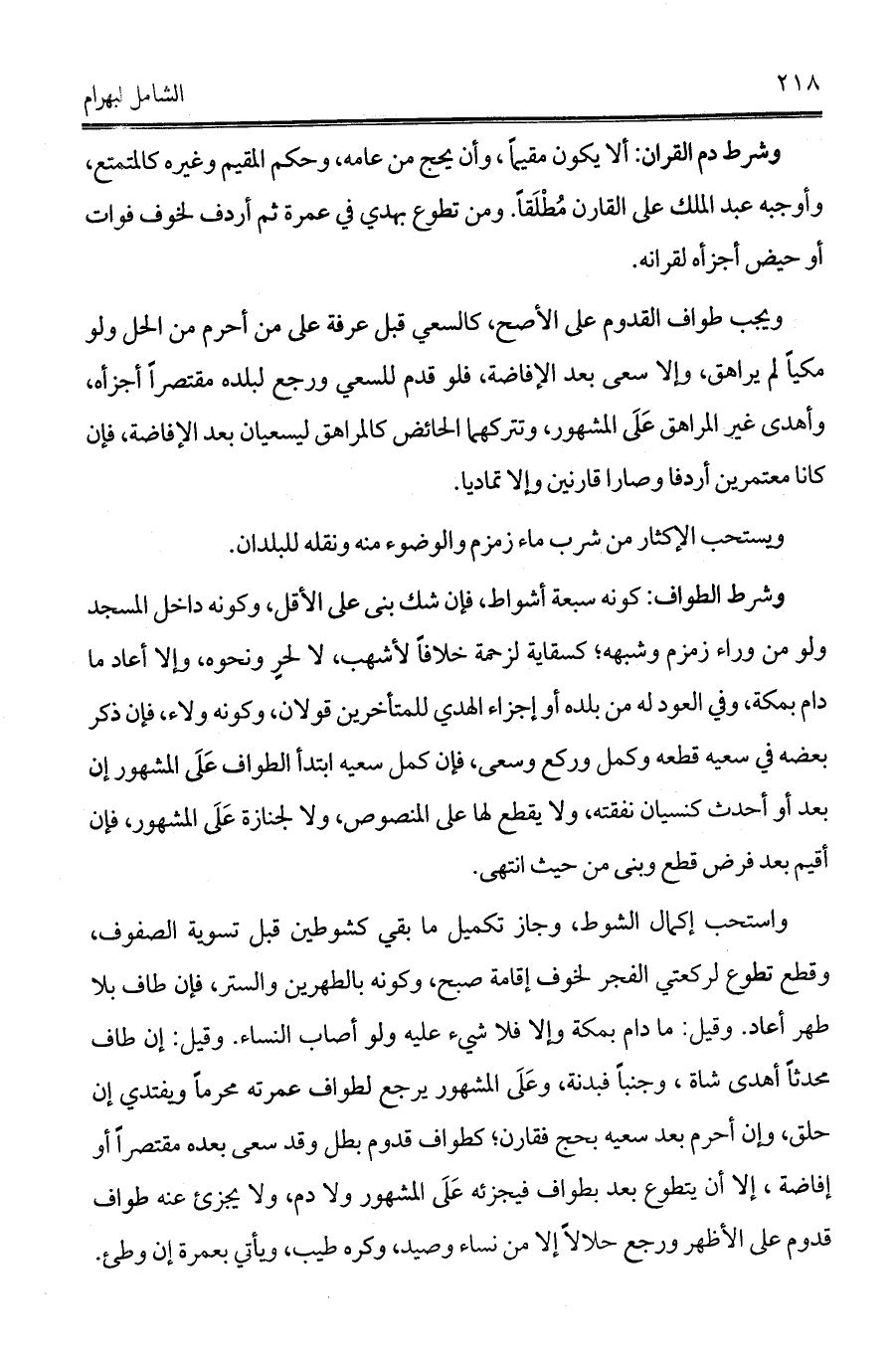 واستحب إكمال الشوط, وجاز تكميل ما بقي كشوطين قبل تسوية الصفوف, وقطع تطوع لركعتي الفجر لخوف إقامة صبح، وكونه بالطهرين والستر, فإن طاف بلا طهر أعاد. وقيل: ما دام بمكة وإلا فلا شيء عليه ولو أصاب النساء. وقيل: إن طاف محدثاً أهدى شاة , وجنباً فبدنة، وعَلَى المشهور يرجع لطواف عمرته محرماً ويفتدي إن حلق, وإن أحرم بعد سعيه بحج فقارن؛ كطواف قدوم بطل وقد سعى بعده مقتصراً أو إفاضة , إلا أن يتطوع بعد بطواف فيجزئه عَلَى المشهور ولا دم, ولا يجزئ عنه طواف قدوم على الأظهر ورجع حلالاً إلا من نساء وصيد, وكره طيب, ويأتي بعمرة إن وطئ.