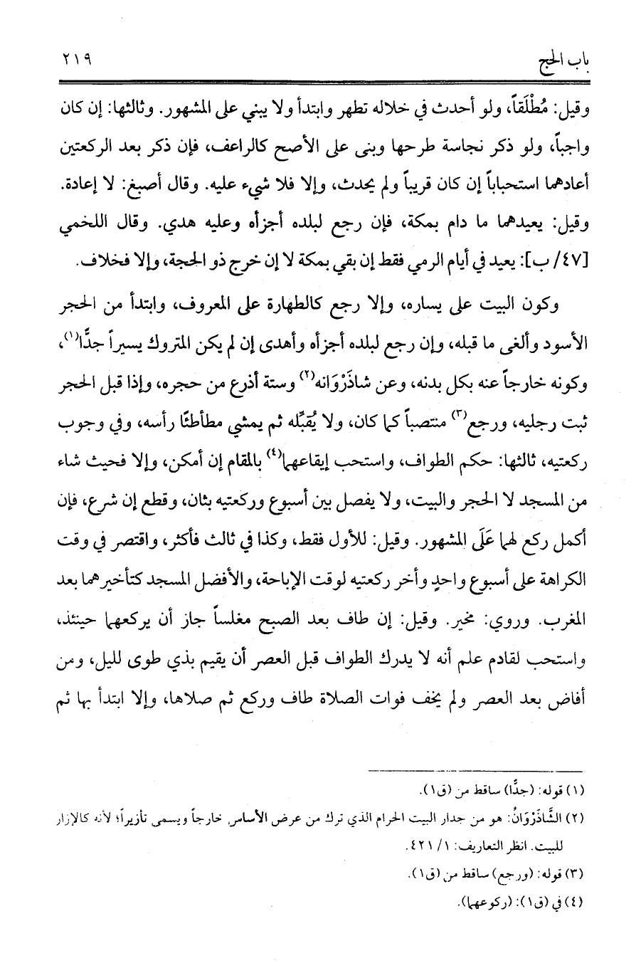 وقيل: مُطْلَقاً، ولو أحدث في خلاله تطهر وابتدأ ولا يبني على المشهور. وثالثها: إن كان واجباً, ولو ذكر نجاسة طرحها وبنى على الأصح كالراعف, فإن ذكر بعد الركعتين أعادهما استحباباً إن كان قريباً ولم يحدث، وإلا فلا شيء عليه. وقال أصبغ: لا إعادة. وقيل: يعيدهما ما دام بمكة، فإن رجع لبلده أجزأه وعليه هدي. وقال اللخمي [47/ب]: يعيد في أيام الرمي فقط إن بقي بمكة لا إن خرج ذو الحجة، وإلا فخلاف.