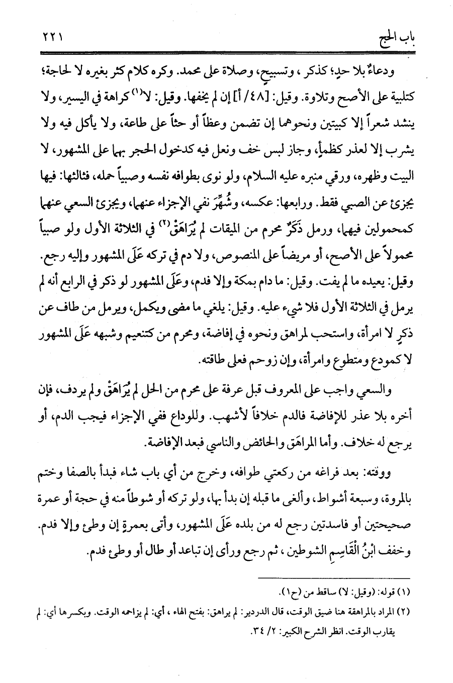 ودعاءٌ بلا حدٍ؛ كذكر , وتسبيحٍ, وصلاة على محمد. وكره كلام كثر بغيره لا لحاجة؛ كتلبية على الأصح وتلاوة. وقيل: [48/أ] إن لم يخفها. وقيل: لا (¬1) كراهة في اليسير، ولا ينشد شعراً إلا كبيتين ونحوهما إن تضمن وعظاً أو حثاً على طاعة، ولا يأكل فيه ولا يشرب إلا لعذر كظمأٍ، وجاز لبس خف ونعل فيه كدخول الحجر بهما على المشهور، لا البيت وظهره، ورقي منبره عليه السلام، ولو نوى بطوافه نفسه وصبياً حمله, فثالثها: فيها يجزئ عن الصبي فقط. ورابعها: عكسه، وشُهِّرَ نفي الإجزاء عنهما، ويجزئ السعي عنهما كمحمولين فيهما، ورمل ذَكَرٌ محرم من الميقات لم يُرَاهَقْ (¬2) في الثلاثة الأول ولو صبياً محمولاً على الأصح، أو مريضاً على المنصوص، ولا دم في تركه عَلَى المشهور وإليه رجع. وقيل: يعيده ما لم يفت. وقيل: ما دام بمكة وإلا فدم، وعَلَى المشهور لو ذكر في الرابع أنه لم يرمل في الثلاثة الأول فلا شيء عليه. وقيل: يلغي ما مضى ويكمل، ويرمل من طاف عن ذكرٍ لا امرأة، واستحب لمراهق ونحوه في إفاضة، ومحرم من كتنعيم وشبهه عَلَى المشهور لا كمودع ومتطوع وامرأة، وإن زوحم فعلى طاقته.