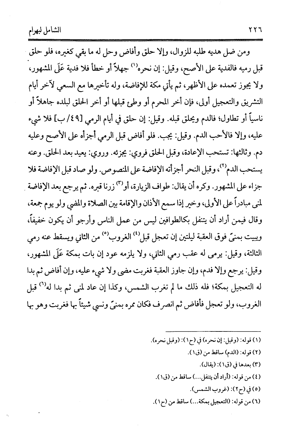 ومن ضل هديه طلبه للزوال، وإلا حلق وأفاض وحل له ما بقي كغيره، فلو حلق قبل رميه فالفدية على الأصح، وقيل: إن نحره (¬1) جهلاً أو خطأ فلا فدية عَلَى المشهور، ولا يجوز تعمده على الأظهر، ثم يأتي مكة للإفاضة، وله تأخيرها مع السعي لآخر أيام التشريق والتعجيل أولى، فإن أخر المحرم أو وطئ قبلها أو أخر الحلق لبلده جاهلاً أو ناسياً أو تطاول؛ فالدم ويحلق قبله. وقيل: إن حلق في أيام الرمي [49/ب] فلا شيء عليه، وإلا فالأحب الدم. وقيل: يجب. فلو أفاض قبل الرمي أجزأه على الأصح وعليه دم. وثالثها: تستحب الإعادة، وقبل الحلق فروي: يجزئه. وروي: يعيد بعد الحلق. وعنه يستحب الدم (¬2)، وقبل النحر أجزأته الإفاضة على المنصوص. ولو صاد قبل الإفاضة فلا جزاء على المشهور. وكره أن يقال: طواف الزيارة، أو (¬3) زرنا قبره. ثم يرجع بعد الإفاضة لمنى مبادراً على الأولى، وخير إذا سمع الأذان والإقامة بين الصلاة والمضي ولو يوم جمعة، وقال فيمن أراد أن يتنفل بكالطوافين ليس من عمل الناس وأرجو أن يكون خفيفاً، ويبيت بمنىً فوق العقبة ليلتين إن تعجل قبل (¬4) الغروب (¬5) من الثاني ويسقط عنه رمي الثالثة، وقيل: يرمى له عقب رمي الثاني، ولا يلزمه عود إن بات بمكة عَلَى المشهور، وقيل: يرجع وإلا فدم، وإن جاوز العقبة فغربت مضى ولا شيء عليه، وإن أفاض ثم بدا له التعجيل بمكة؛ فله ذلك ما لم تغرب الشمس، وكذا إن عاد لمنى ثم بدا له (¬6) قبل الغروب، ولو تعجل فأفاض ثم انصرف فكان ممره بمنىً ونسي شيئاً بها فغربت وهو بها