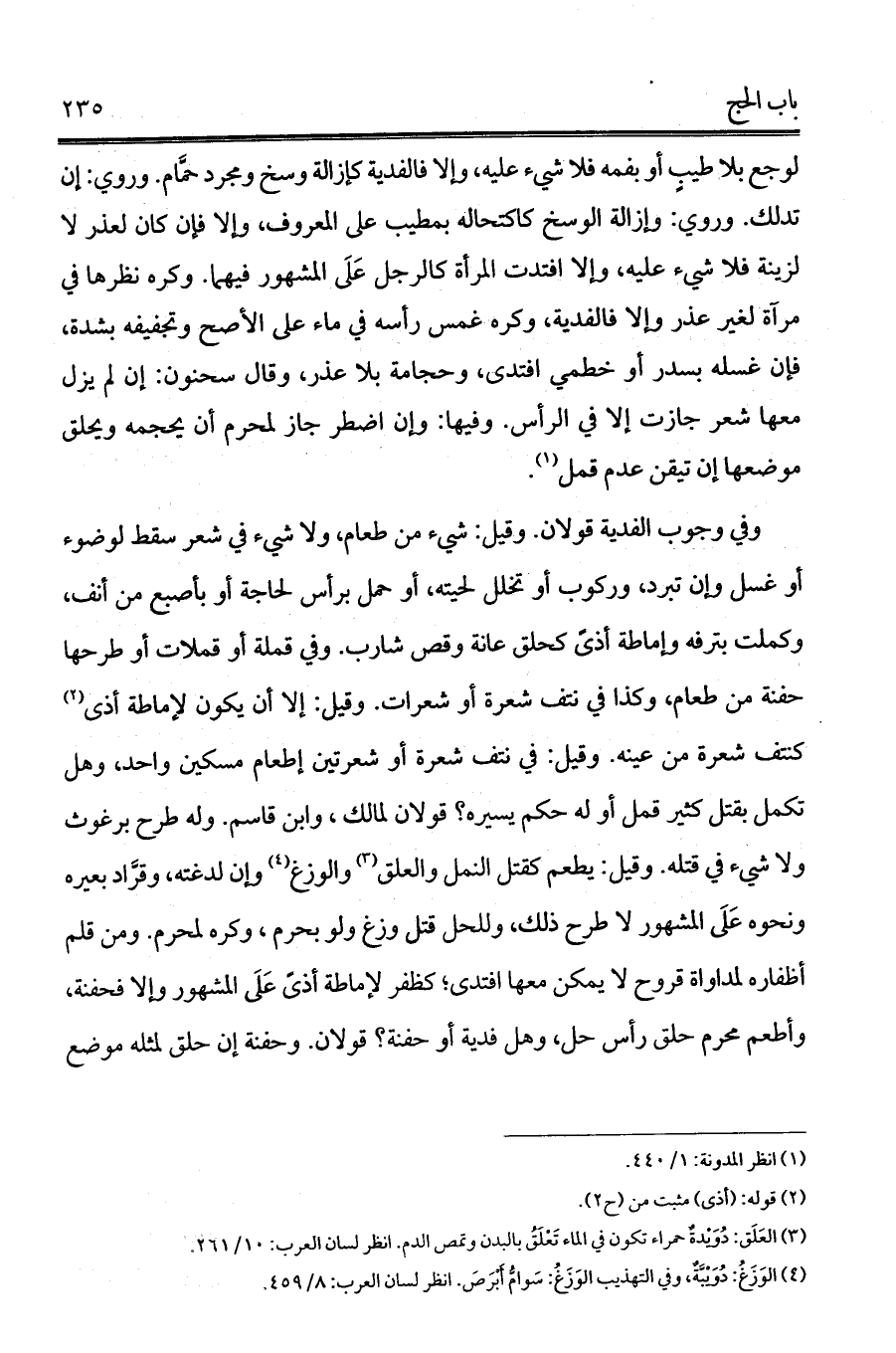 وفي وجوب الفدية قولان. وقيل: شيء من طعام، ولا شيء في شعر سقط لوضوء أو غسل وإن تبرد، وركوب أو تخلل لحيته, أو حمل برأس لحاجة أو بأصبع من أنف، وكملت بترفه وإماطة أذىً كحلق عانة وقص شارب. وفي قملة أو قملات أو طرحها حفنة من طعام، وكذا في نتف شعرة أو شعرات. وقيل: إلا أن يكون لإماطة أذى (¬2) كنتف شعرة من عينه. وقيل: في نتف شعرة أو شعرتين إطعام مسكين واحد، وهل تكمل بقتل كثير قمل أو له حكم يسيره؟ قولان لمالك , وابن قاسم. وله طرح برغوث ولا شيء في قتله. وقيل: يطعم كقتل النمل والعلق (¬3) والوزغ (¬4) وإن لدغته، وقرَّاد بعيره ونحوه عَلَى المشهور لا طرح ذلك، وللحل قتل وزغ ولو بحرم , وكره لمحرم. ومن قلم أظفاره لمداواة قروح لا يمكن معها افتدى؛ كظفر لإماطة أذىً عَلَى المشهور وإلا فحفنة، وأطعم محرم حلق رأس حل، وهل فدية أو حفنة؟ قولان. وحفنة إن حلق لمثله موضع