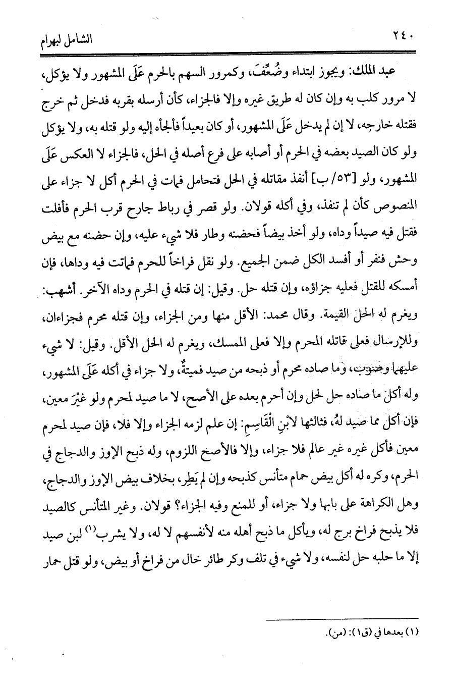 عبد الملك: ويجوز ابتداء وضُعِّفَ، وكمرور السهم بالحرم عَلَى المشهور ولا يؤكل، لا مرور كلب به وإن كان له طريق غيره وإلا فالجزاء، كأن أرسله بقربه فدخل ثم خرج فقتله خارجه، لا إن لم يدخل عَلَى المشهور، أو كان بعيداً فألجأه إليه ولو قتله به، ولا يؤكل ولو كان الصيد بعضه في الحرم أو أصابه على فرع أصله في الحل، فالجزاء لا العكس عَلَى المشهور، ولو [53/ب] أنفذ مقاتله في الحل فتحامل فمات في الحرم أكل لا جزاء على المنصوص كأن لم تنفذ, وفي أكله قولان. ولو قصر في رباط جارح قرب الحرم فأفلت فقتل فيه صيداً وداه، ولو أخذ بيضاً فحضنه وطار فلا شيء عليه، وإن حضنه مع بيض وحش فنفر أو أفسد الكل ضمن الجميع. ولو نقل فراخاً للحرم فماتت فيه وداها، فإن أمسكه للقتل فعليه جزاؤه، وإن قتله حل. وقيل: إن قتله في الحرم وداه الآخر. أشهب: ويغرم له الحل القيمة. وقال محمد: الأقل منها ومن الجزاء، وإن قتله محرم فجزاءان، وللإرسال فعلى قاتله المحرم وإلا فعلى الممسك، ويغرم له الحل الأقل. وقيل: لا شيء عليهما وصوب، وما صاده محرم أو ذبحه من صيد فميتةٌ، ولا جزاء في أكله عَلَى المشهور، وله أكل ما صاده حل لحل وإن أحرم بعده على الأصح، لا ما صيد لمحرم ولو غيْرَ معين، فإن أكل مما صيد لهُ، فثالثها لابْنِ الْقَاسِمِ: إن علم لزمه الجزاء وإلا فلا، فإن صيد لمحرم معين فأكل غيره غير عالم فلا جزاء، وإلا فالأصح اللزوم، وله ذبح الإوز والدجاج في الحرم، وكره له أكل بيض حمام متأنس كذبحه وإن لم يَطِر, بخلاف بيض الإوز والدجاج، وهل الكراهة على بابها ولا جزاء, أو للمنع وفيه الجزاء؟ قولان. وغير المتأنس كالصيد فلا يذبح فراخ برج له، ويأكل ما ذبح أهله منه لأنفسهم لا له، ولا يشرب (¬1) لبن صيد إلا ما حلبه حل لنفسه، ولا شيء في تلف وكر طائر خال من فراخ أو بيض، ولو قتل حمار