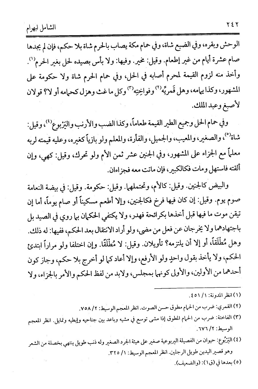 الوحش وبقره، وفي الضبع شاة، وفي حمام مكة يصاب بالحرم شاة بلا حكم، فإن لم يجدها صام عشرة أيام من غير إطعام. وقيل: مخير. وفيها: ولا بأس بصيده لحل بغير الحرم (¬1). وأخذ منه لزوم القيمة لمحرم أصابه في الحل، وفي حمام الحرم شاة ولا حكومة على المشهور، وكذا يمامه، وهل قَمريِّه (¬2) وفواخِتِه (¬3) وكل ما غث وهزل كحمامه أو لا؟ قولان لأصبغ وعبد الملك.