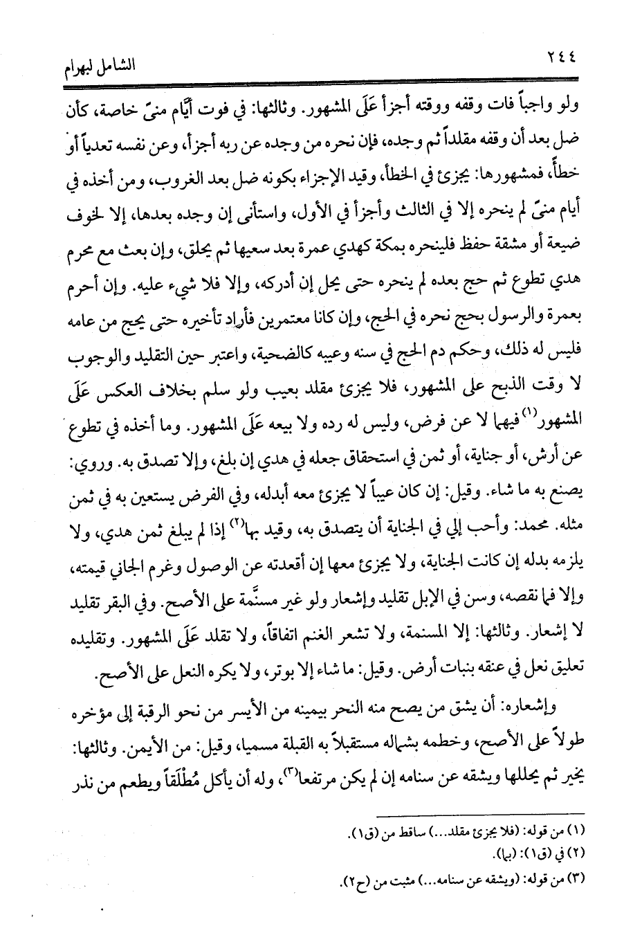 وثالثها: في فوت أيَّام منىً خاصة، كأن ضل بعد أن وقفه مقلداً ثم وجده، فإن نحره من وجده عن ربه أجزأ, وعن نفسه تعدياً أو خطأً، فمشهورها: يجزئ في الخطأ، وقيد الإجزاء بكونه ضل بعد الغروب، ومن أخذه في أيام منىً لم ينحره إلا في الثالث وأجزأ في الأول، واستأنى إن وجده بعدها, إلا لخوف ضيعة أو مشقة حفظ فلينحره بمكة كهدي عمرة بعد سعيها ثم يحلق، وإن بعث مع محرم هدي تطوع ثم حج بعده لم ينحره حتى يحل إن أدركه، وإلا فلا شيء عليه. وإن أحرم بعمرة والرسول بحج نحره في الحج، وإن كانا معتمرين فأراد تأخيره حتى يحج من عامه فليس له ذلك، وحكم دم الحج في سنه وعيبه كالضحية، واعتبر حين التقليد والوجوب لا وقت الذبح على المشهور، فلا يجزئ مقلد بعيب ولو سلم بخلاف العكس عَلَى المشهور (¬1) فيهما لا عن فرض، وليس له رده ولا بيعه عَلَى المشهور. وما أخذه في تطوع عن أرش، أو جناية, أو ثمن في استحقاق جعله في هدي إن بلغ، وإلا تصدق به. وروي: يصنع به ما شاء. وقيل: إن كان عيباً لا يجزئ معه أبدله، وفي الفرض يستعين به في ثمن مثله. محمد: وأحب إلي في الجناية أن يتصدق به، وقيد بها (¬2) إذا لم يبلغ ثمن هدي، ولا يلزمه بدله إن كانت الجناية، ولا يجزئ معها إن أقعدته عن الوصول وغرم الجاني قيمته، وإلا فما نقصه، وسن في الإبل تقليد وإشعار ولو غير مسنَّمة على الأصح. وفي البقر تقليد لا إشعار. وثالثها: إلا المسنمة، ولا تشعر الغنم اتفاقاً، ولا تقلد عَلَى المشهور. وتقليده تعليق نعل في عنقه بنبات أرض. وقيل: ما شاء إلا بوتر، ولا يكره النعل على الأصح.