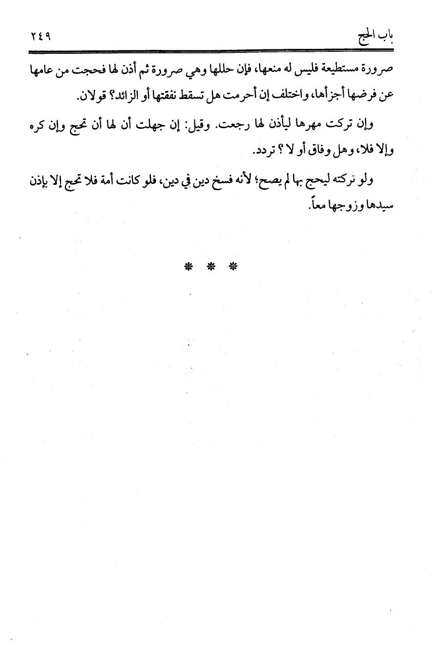 صرورة مستطيعة فليس له منعها، فإن حللها وهي صرورة ثم أذن لها فحجت من عامها عن فرضها أجزأها، واختلف إن أحرمت هل تسقط نفقتها أو الزائد؟ قولان. وإن تركت مهرها ليأذن لها رجعت. وقيل: إن جهلت أن لها أن تحج وإن كره وإلا فلا، وهل وفاق أو لا؟ تردد. ولو تركته ليحج بها لم يصح؛ لأنه فسخ دين في دين، فلو كانت أمة فلا تحج إلا بإذن سيدها وزوجها معاً.