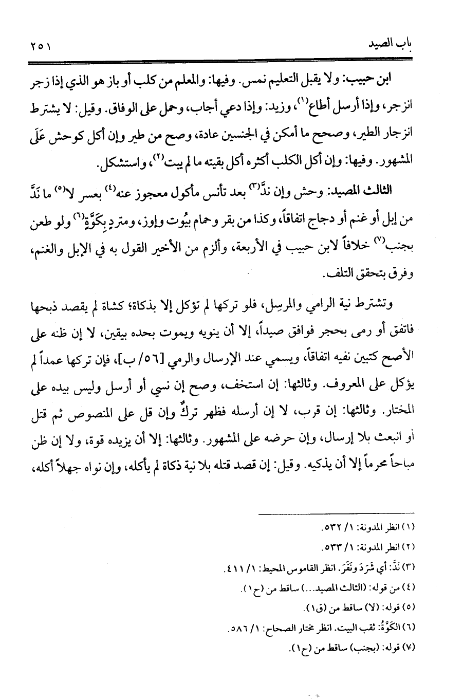 الثالث المصيد: وحش وإن ندَّ (¬3) بعد تأنس مأكول معجوز عنه (¬4) بعسر لا (¬5) ما نَدَّ من إبل أو غنم أو دجاج اتفاقاً، وكذا من بقر وحمام بيُوت وإوز, ومتردٍ بِكَوَّةٍ (¬6) ولو طعن بجنب (¬7) خلافاً لابن حبيب في الأربعة، وألزم من الأخير القول به في الإبل والغنم، وفرق بتحقق التلف.
