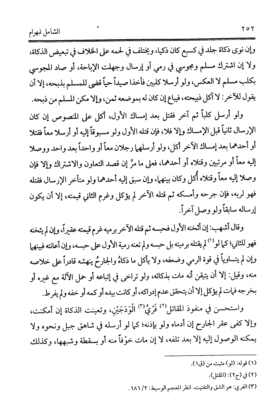 وإن نوى ذكاة جلد في كسبع كان ذكيا, ويختلف في لحمه على الخلاف في تبعيض الذكاة، ولا إن اشترك مسلم ومجوسي في رمي أو إرسال وجهلت الإباحة, أو صاد المجوسي بكلب مسلم لا العكس، ولو أرسلا كلبين فأخذا صيداً حياً قضى للمسلم بذبحه، إلا أن يقول للآخر: لا آكل ذبيحته، فيباع إن كان له بموضعه ثمن، وإلا مكن المسلم من ذبحه، ولو أرسل كلباً ثم آخر فقتل بعد إمساك الأول, أكل على المنصوص إن كان الإرسال ثانياً قبل الإمساك وإلا فلا، فإن قتله الأول ولو مسبوقاً إليه أو أرسلا معاً فقتلا أو أحدهما بعد إمساك الآخر أكل، ولو أرسلهما رجلان معاً أو واحداً بعد واحد ووصلا إليه معاً أو مرتبين وقتلاه أو أحدهما، فعلى ما مرَّ إن قصد التعاون والاشتراك وإلا فإن وصلا إليه معاً وقتلاه أُكل وكان بينهما، وإن سبق إليه أحدهما ولو متأخر الإرسال فقتله فهو لربه، فإن جرحه وأمسكه ثم قتله الآخر لم يؤكل وغرم الثاني قيمته, إلا أن يكون إرساله سابقاً ولو وصل آخراً. وقال أشهب: إن أثخنه الأول فحبسه ثم قتله الآخر برميه غرم قيمته عقيراً، وإن لم يثخنه فهو للثاني؛ كما لو (¬1) لم يقتله برميته بل حبسه ولم تعنه رمية الأول على حبسه، وإن أعانته فبينهما وإن لم يتساوياً في قوة الرمي وضعفه، ولا يأكل ما ذكاهُ والجارحُ ينهشه قادراً على خلاصه منه, وقيل: إلا أن يتيقن أنه مات بذكاته، ولو تراخى في إتباعه أو حمل الآلة مع غيره أو بخرجه فمات لم يؤكل إلا أن يتحقق عدم إدراكه، أو كانت بيده أو كمه أو خفه ولم يفرط.