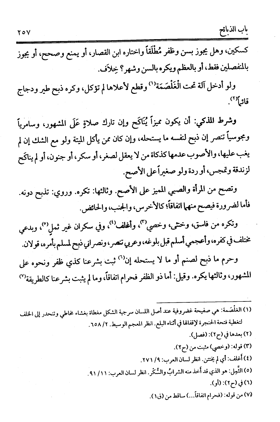 كسكين، وهل يجوز بسن وظفر مُطْلَقاً واختاره ابن القصار، أو يمنع وصحح، أو يجوز بالمنفصلين فقط، أو بالعظم ويكره بالسن وشهر؟ خِلاَف. ولو أدخل آلة تحت الْغَلْصَمَة (¬1)
