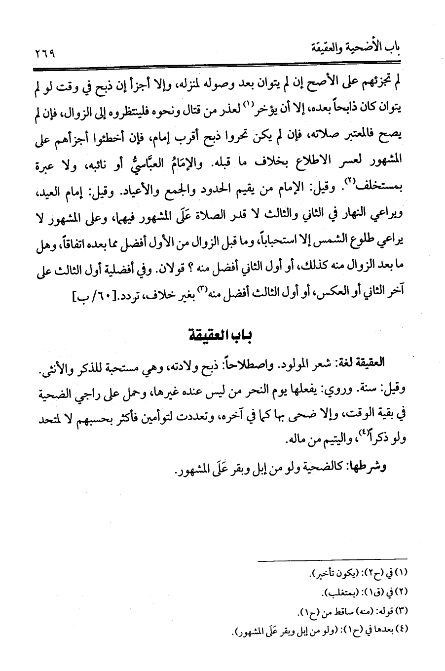 العقيقة لغة: شعر المولود. واصطلاحاً: ذبح ولادته, وهي مستحبة للذكر والأنثى. وقيل: سنة. وروي: يفعلها يوم النحر من ليس عنده غيرها، وحمل على راجي الضحية في بقية الوقت، وإلا ضحى بها كما في آخره، وتعددت لتوأمين فأكثر بحسبهم لا لمتحد ولو ذكراً (¬4)، واليتيم من ماله.