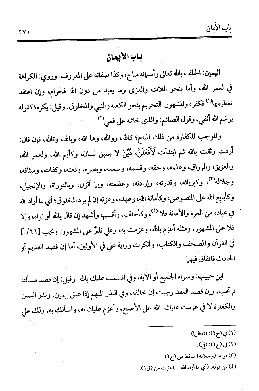 والموجب للكفارة من ذلك المباح؛ كالله، ووالله، وها الله، وبالله، وتالله، فإن قال: أردت وثقت بالله ثم ابتدأت لَأَفْعَلَنَّ، دُيِّنَ لا بسبق لسان، وكأيم الله، ولعمر الله، والعزيز، والرزاق، وعلمه، وحقه، وقسمه، وسمعه، وبصره، وذمته، وكفالته، وميثاقه، وجلاله (¬3)، وكبريائه، وقدرته، وإرادته، وعظمته، وبما أنزل، وبالتوراة، والإنجيل، وكأبايع الله على المنصوص، وكأمانة الله، وعهده، وعزته إن لم يرد المخلوق؛ أي ما أراد الله في عباده من العزة والأمانة فلا (¬4)، وكأحلف، وأقسم، وأشهد إن قال بالله أو نواه، وإلا فلا على المشهور، ومثله أعزم بالله، وعزمت به، وعلي نذرٌ على المشهور. وتجب [61/أ] في القرآن والمصحف والكتاب، وأنكرت رواية علي في الأولين، أما إن قصد القديم أو الحادث فاتفاق فيهما.