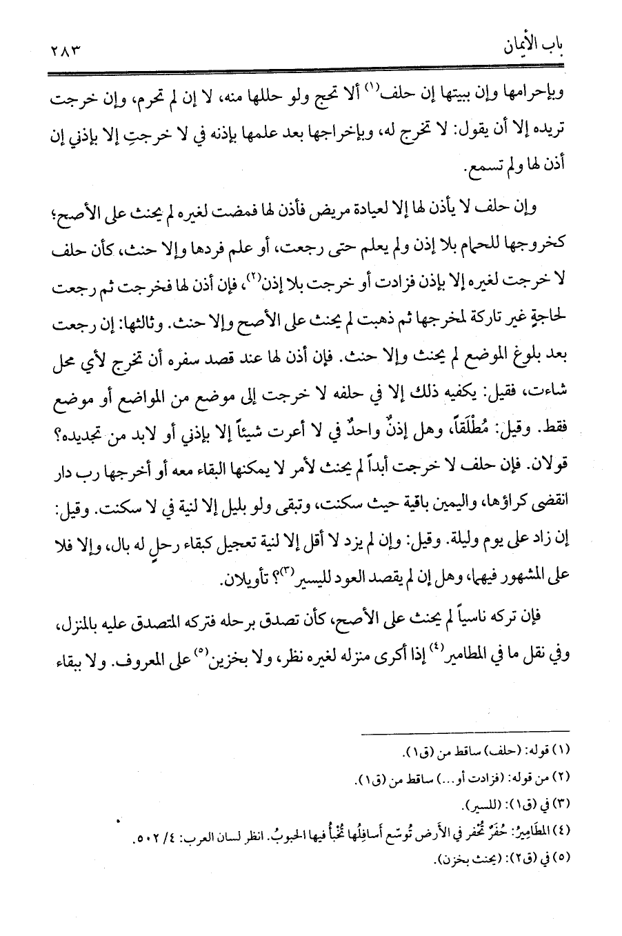 وإن حلف لا يأذن لها إلا لعيادة مريض فأذن لها فمضت لغيره لم يحنث على الأصح؛ كخروجها للحمام بلا إذن ولم يعلم حتى رجعت، أو علم فردها وإلا حنث، كأن حلف لا خرجت لغيره إلا بإذن فزادت أو خرجت بلا إذن (¬2)، فإن أذن لها فخرجت ثم رجعت لحاجةٍ غير تاركة لمخرجها ثم ذهبت لم يحنث على الأصح وإلا حنث. وثالثها: إن رجعت بعد بلوغ الموضع لم يحنث وإلا حنث. فإن أذن لها عند قصد سفره أن تخرج لأي محل شاءت، فقيل: يكفيه ذلك إلا في حلفه لا خرجت إلى موضع من المواضع أو موضع فقط. وقيل: مُطْلَقاً، وهل إذنٌ واحدٌ في لا أعرت شيئاً إلا بإذني أو لابد من تجديده؟ قولان. فإن حلف لا خرجت أبداً لم يحنث لأمر لا يمكنها البقاء معه أو أخرجها رب دار انقضى كراؤها، واليمين باقية حيث سكنت، وتبقى ولو بليل إلا لنية في لا سكنت. وقيل: إن زاد على يوم وليلة. وقيل: وإن لم يزد لا أقل إلا لنية تعجيل كبقاء رحلٍ له بال، وإلا فلا على المشهور فيهما، وهل إن لم يقصد العود لليسير (¬3)؟ تأويلان. فإن تركه ناسياً لم يحنث على الأصح، كأن تصدق برحله فتركه المتصدق عليه بالمنزل، وفي نقل ما في المطامير (¬4) إذا أكرى منزله لغيره نظر، ولا بخزين (¬5) على المعروف. ولا ببقاء