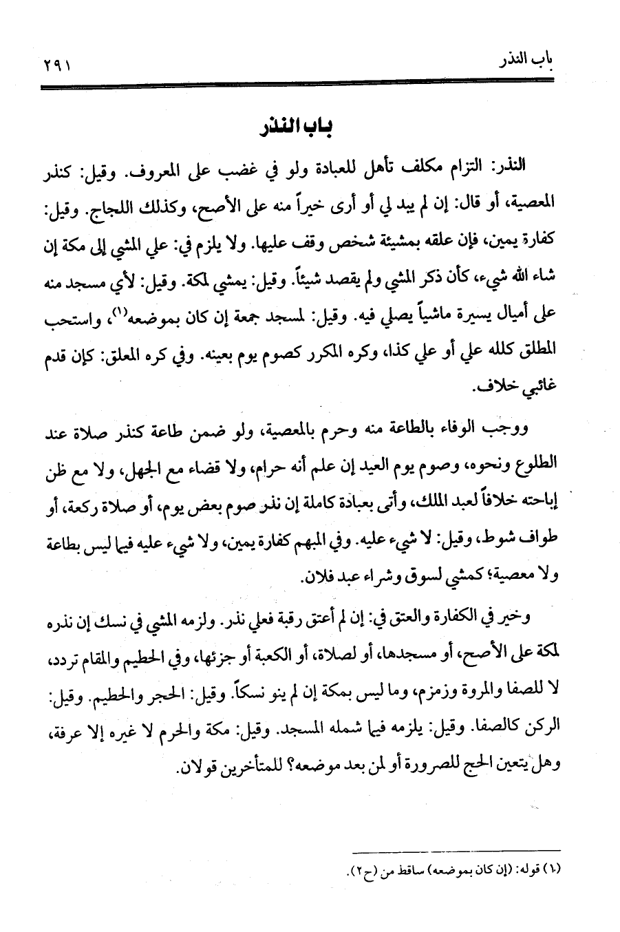 ووجب الوفاء بالطاعة منه وحرم بالمعصية، ولو ضمن طاعة كنذر صلاة عند الطلوع ونحوه، وصوم يوم العيد إن علم أنه حرام، ولا قضاء مع الجهل، ولا مع ظن إباحته خلافاً لعبد الملك، وأتى بعبادة كاملة إن نذر صوم بعض يوم، أو صلاة ركعة، أو طواف شوط، وقيل: لا شيء عليه. وفي المبهم كفارة يمين، ولا شيء عليه فيما ليس بطاعة ولا معصية؛ كمشي لسوق وشراء عبد فلان. وخير في الكفارة والعتق في: إن لم أعتق رقبة فعلي نذر. ولزمه المشي في نسك إن نذره لمكة على الأصح، أو مسجدها، أو لصلاة، أو الكعبة أو جزئها، وفي الحطيم والمقام تردد، لا للصفا والمروة وزمزم، وما ليس بمكة إن لم ينو نسكاً. وقيل: الحجر والحطيم. وقيل: الركن كالصفا. وقيل: يلزمه فيما شمله المسجد. وقيل: مكة والحرم لا غيره إلا عرفة، وهل يتعين الحج للصرورة أو لمن بعد موضعه؟ للمتأخرين قولان.
