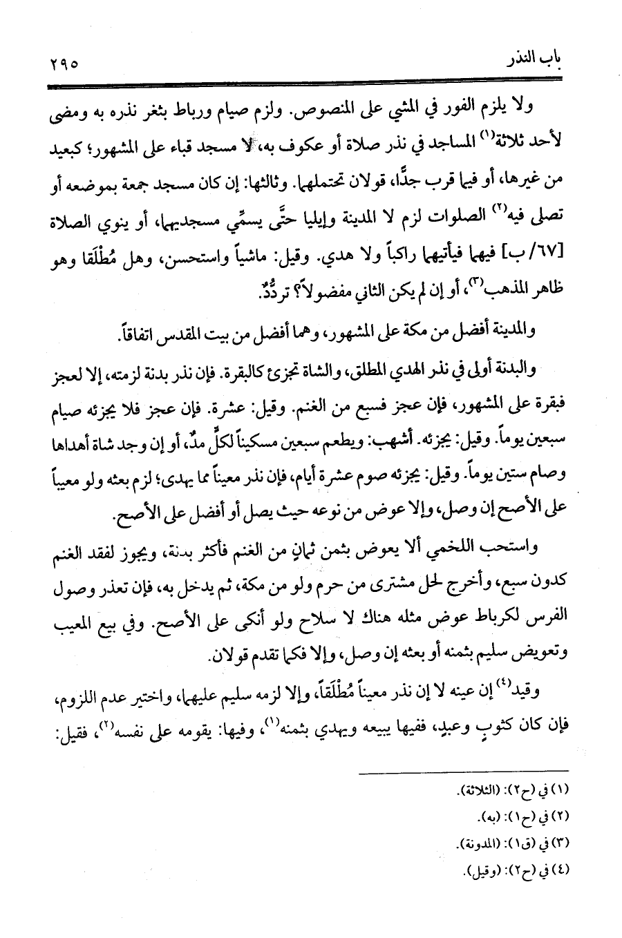 ولا يلزم الفور في المشي على المنصوص. ولزم صيام ورباط بثغر نذره به ومضى لأحد ثلاثة (¬1) المساجد في نذر صلاة أو عكوف به، لا مسجد قباء على المشهور؛ كبعيد من غيرها، أو فيما قرب جدًّا، قولان تحتملهما. وثالثها: إن كان مسجد جمعة بموضعه أو تصلى فيه (¬2) الصلوات لزم لا المدينة وإيليا حتَّى يسمِّي مسجديهما، أو ينوي الصلاة [67/ب] فيهما فيأتيهما راكباً ولا هدي. وقيل: ماشياً واستحسن، وهل مُطْلَقا وهو ظاهر المذهب (¬3)، أو إن لم يكن الثاني مفضولاً؟ تردُّدٌ.