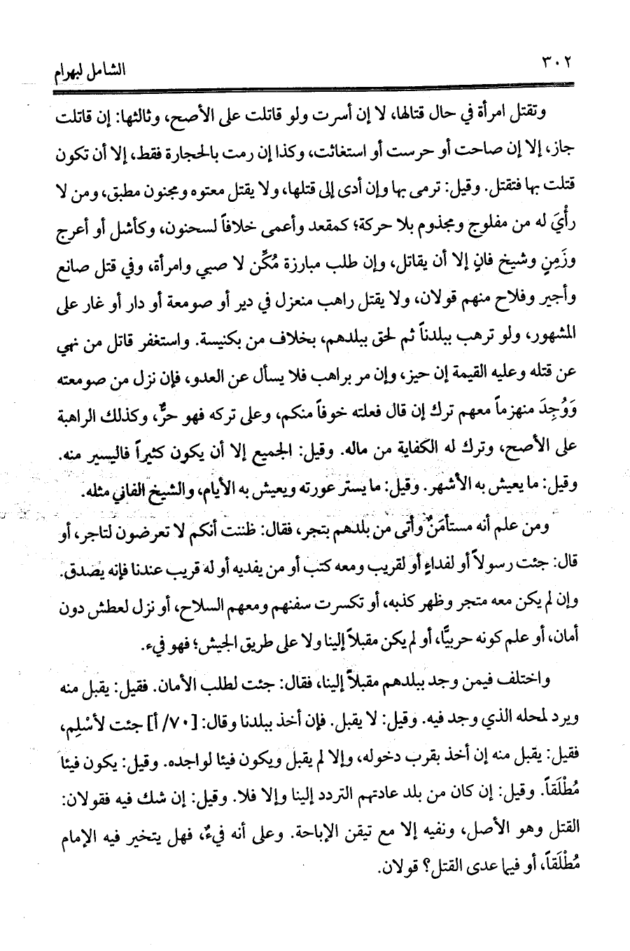 وتقتل امرأة في حال قتالها، لا إن أسرت ولو قاتلت على الأصح، وثالثها: إن قاتلت جاز، إلا إن صاحت أو حرست أو استغاثت، وكذا إن رمت بالحجارة فقط، إلا أن تكون قتلت بها فتقتل. وقيل: ترمى بها وإن أدى إلى قتلها، ولا يقتل معتوه ومجنون مطبق، ومن لا رأْيَ له من مفلوج ومجذوم بلا حركة؛ كمقعد وأعمى خلافاً لسحنون، وكأشل أو أعرج وزَمِنٍ وشيخ فانٍ إلا أن يقاتل، وإن طلب مبارزة مُكِّن لا صبي وامرأة، وفي قتل صانع وأجير وفلاح منهم قولان، ولا يقتل راهب منعزل في دير أو صومعة أو دار أو غار على المشهور، ولو ترهب ببلدناً ثم لحق ببلدهم، بخلاف من بكنيسة. واستغفر قاتل من نهي عن قتله وعليه القيمة إن حيز، وإن مر براهب فلا يسأل عن العدو، فإن نزل من صومعته وَوُجِدَ منهزماً معهم ترك إن قال فعلته خوفاً منكم، وعلى تركه فهو حرٌّ، وكذلك الراهبة على الأصح، وترك له الكفاية من ماله. وقيل: الجميع إلا أن يكون كثيراً فاليسير منه. وقيل: ما يعيش به الأشهر. وقيل: ما يستر عورته ويعيش به الأيام، والشيخ الفاني مثله.
