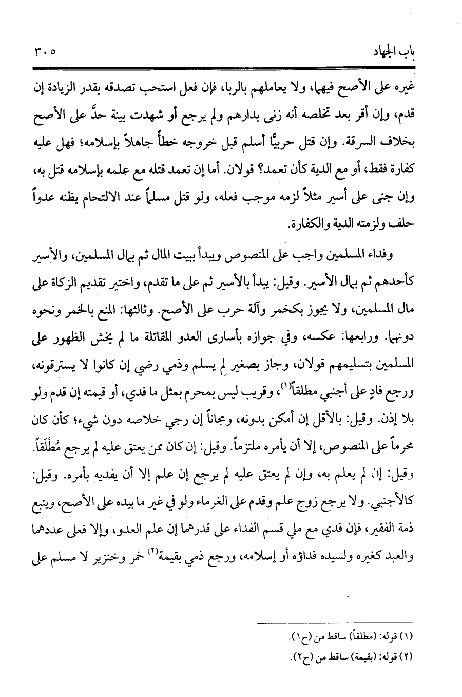 غيره على الأصح فيهما، ولا يعاملهم بالربا، فإن فعل استحب تصدقه بقدر الزيادة إن قدم، وإن أقر بعد تخلصه أنه زنى بدارهم ولم يرجع أو شهدت بينة حدَّ على الأصح بخلاف السرقة. وإن قتل حربيًّا أسلم قبل خروجه خطأً جاهلاً بإسلامه؛ فهل عليه كفارة فقط، أو مع الدية كأن تعمد؟ قولان. أما إن تعمد قتله مع علمه بإسلامه قتل به، وإن جنى على أسير مثلاً لزمه موجب فعله، ولو قتل مسلماً عند الالتحام يظنه عدواً حلف ولزمته الدية والكفارة.