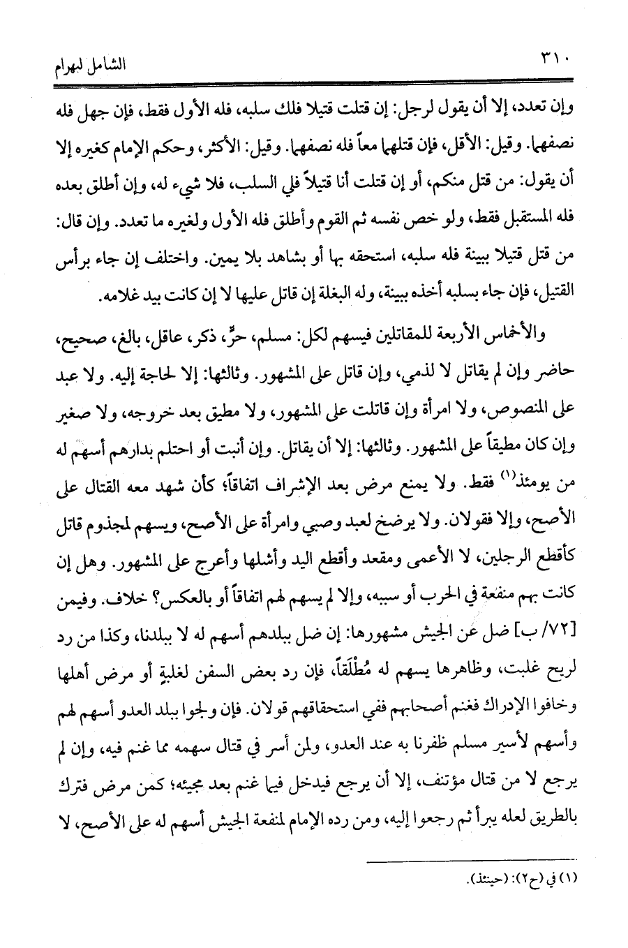 والأخماس الأربعة للمقاتلين فيسهم لكل: مسلم، حرٍّ، ذكر، عاقل، بالغ، صحيح، حاضر وإن لم يقاتل لا لذمي، وإن قاتل على المشهور. وثالثها: إلا لحاجة إليه. ولا عبد على المنصوص، ولا امرأة وإن قاتلت على المشهور، ولا مطيق بعد خروجه، ولا صغير وإن كان مطيقاً على المشهور. وثالثها: إلا أن يقاتل. وإن أنبت أو احتلم بدارهم أسهم له من يومئذ (¬1) فقط. ولا يمنع مرض بعد الإشراف اتفاقاً؛ كأن شهد معه القتال على الأصح، وإلا فقولان. ولا يرضخ لعبد وصبي وامرأة على الأصح، ويسهم لمجذوم قاتل كأقطع الرجلين، لا الأعمى ومقعد وأقطع اليد وأشلها وأعرج على المشهور. وهل إن كانت بهم منفعة في الحرب أو سببه، وإلا لم يسهم لهم اتفاقاً أو بالعكس؟ خلاف. وفيمن [72/ب] ضل عن الجيش مشهورها: إن ضل ببلدهم أسهم له لا ببلدنا، وكذا من رد لريح غلبت، وظاهرها يسهم له مُطْلَقاً، فإن رد بعض السفن لغلبةٍ أو مرض أهلها وخافوا الإدراك فغنم أصحابهم ففي استحقاقهم قولان. فإن ولجوا ببلد العدو أسهم لهم وأسهم لأسير مسلم ظفرنا به عند العدو، ولمن أسر في قتال سهمه مما غنم فيه، وإن لم يرجع لا من قتال مؤتنف، إلا أن يرجع فيدخل فيما غنم بعد مجيئه؛ كمن مرض فترك بالطريق لعله يبرأ ثم رجعوا إليه، ومن رده الإمام لمنفعة الجيش أسهم له على الأصح، لا