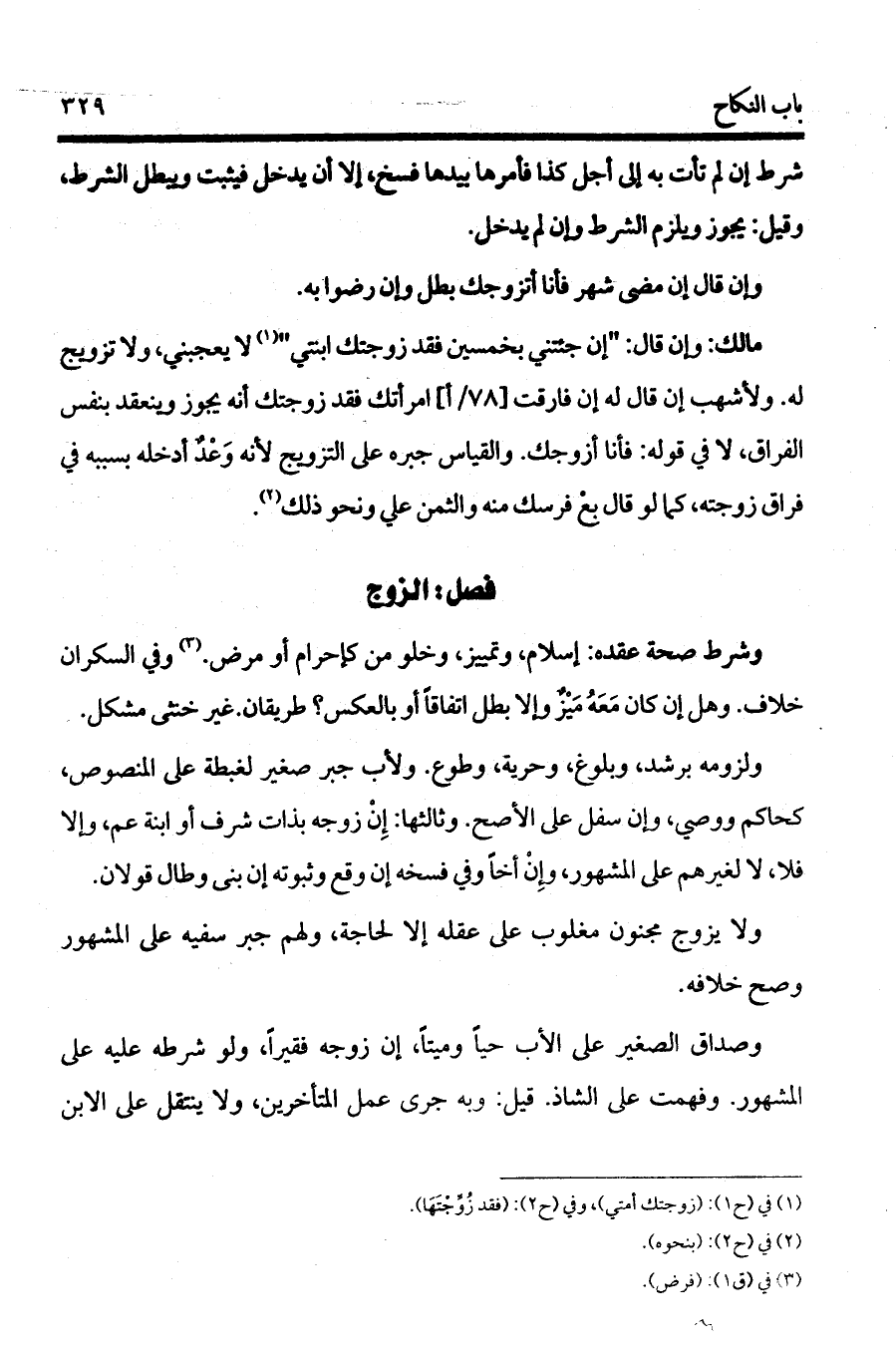 ولزومه برشد، وبلوغ، وحرية، وطوع. ولأب جبر صغير لغبطة على المنصوص، كحاكم ووصي، وإن سفل على الأصح. وثالثها: إِنْ زوجه بذات شرف أو ابنة عم، وإلا فلا، لا لغيرهم على المشهور، وإِنْ أخاً وفي فسخه إن وقع وثبوته إن بنى وطال قولان.
