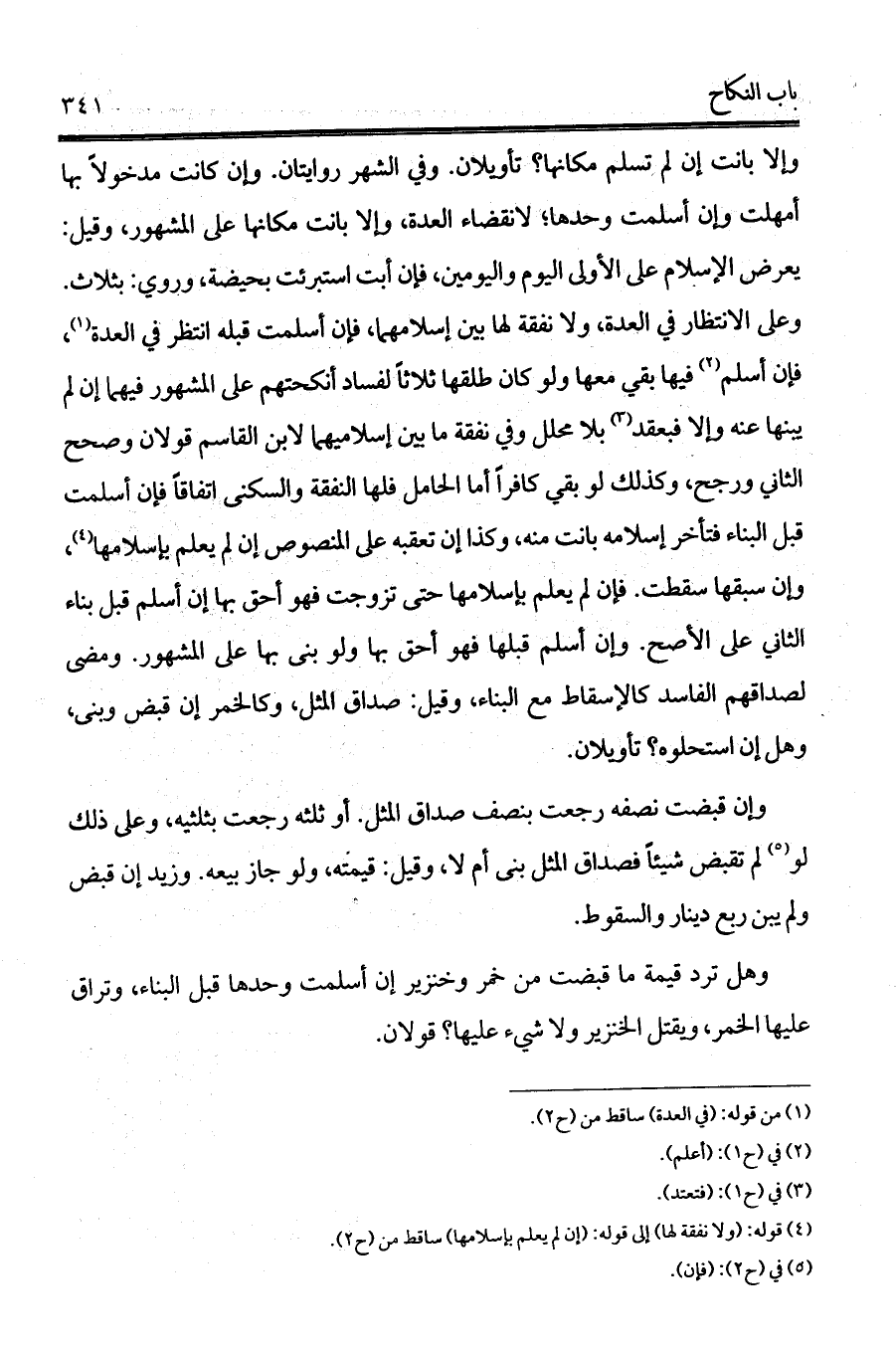 وإلا بانت إن لم تسلم مكانها؟ تأويلان. وفي الشهر روايتان. وإن كانت مدخولاً بها أمهلت وإن أسلمت وحدها؛ لانقضاء العدة، وإلا بانت مكانها على المشهور، وقيل: يعرض الإسلام على الأولى اليوم واليومين، فإن أبت استبرئت بحيضة، وروي: بثلاث. وعلى الانتظار في العدة، ولا نفقة لها بين إسلامهما، فإن أسلمت قبله انتظر في العدة (¬1)، فإن أسلم (¬2) فيها بقي معها ولو كان طلقها ثلاثاً لفساد أنكحتهم على المشهور فيهما إن لم يبنها عنه وإلا فبعقد (¬3) بلا محلل وفي نفقة ما بين إسلاميهما لابن القاسم قولان وصحح الثاني ورجح، وكذلك لو بقي كافراً أما الحامل فلها النفقة والسكنى اتفاقاً فإن أسلمت قبل البناء فتأخر إسلامه بانت منه، وكذا إن تعقبه على المنصوص إن لم يعلم بإسلامها (¬4)، وإن سبقها سقطت. فإن لم يعلم بإسلامها حتى تزوجت فهو أحق بها إن أسلم قبل بناء الثاني على الأصح. وإن أسلم قبلها فهو أحق بها ولو بنى بها على المشهور. ومضى لصداقهم الفاسد كالإسقاط مع البناء، وقيل: صداق المثل، وكالخمر إن قبض وبنى، وهل إن استحلوه؟ تأويلان.