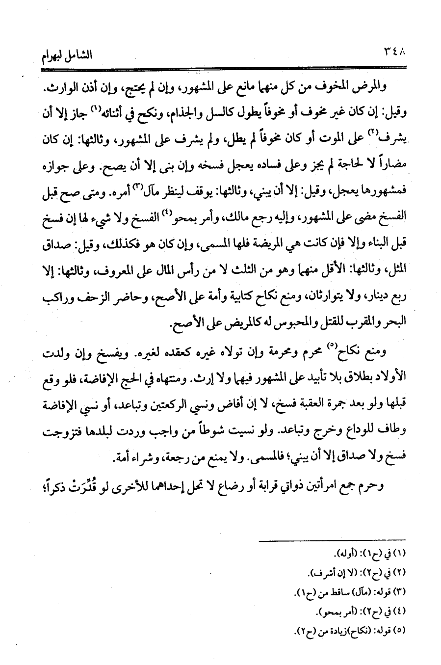والمرض المخوف من كل منهما مانع على المشهور، وإن لم يحتج، وإن أذن الوارث. وقيل: إن كان غير مخوف أو مخوفاً يطول كالسل والجذام، ونكح في أثنائه (¬1) جاز إلا أن يشرف (¬2) على الموت أو كان مخوفاً لم يطل، ولم يشرف على المشهور، وثالثها: إن كان مضاراً لا لحاجة لم يجز وعلى فساده يعجل فسخه وإن بنى إلا أن يصح. وعلى جوازه فمشهورها يعجل، وقيل: إلا أن يبني، وثالثها: يوقف لينظر مآل (¬3) أمره. ومتى صح قبل الفسخ مضى على المشهور، وإليه رجع مالك، وأمر بمحو (¬4) الفسخ ولا شيء لها إن فسخ قبل البناء وإلا فإن كانت هي المريضة فلها المسمى، وإن كان هو فكذلك، وقيل: صداق المثل، وثالثها: الأقل منهما وهو من الثلث لا من رأس المال على المعروف، وثالثها: إلا ربع دينار، ولا يتوارثان، ومنع نكاح كتابية وأمة على الأصح، وحاضر الزحف وراكب البحر والمقرب للقتل والمحبوس له كالمريض على الأصح.