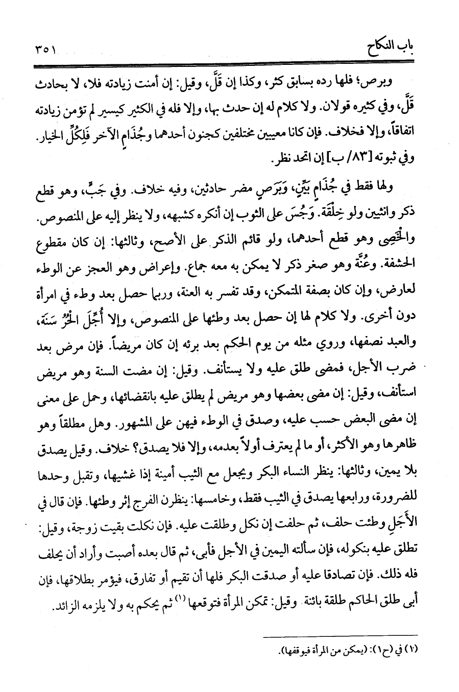 ولها فقط في جُذَامٍ بَيِّنٍ، وَبَرَصٍ مضر حادثين، وفيه خلاف. وفي جَبٍّ، وهو قطع ذكر وانثيين ولو خِلْقَة. وَجُسَ على الثوب إن أنكره كشبهه، ولا ينظر إليه على المنصوص. والْخَصِى وهو قطع أحدهما، ولو قائم الذكر على الأصح، وثالثها: إن كان مقطوع الحشفة. وعُنَّة وهو صغر ذكر لا يمكن به معه جماع. وإعراض وهو العجز عن الوطء لعارض، وإن كان بصفة المتمكن، وقد تفسر به العنة، وربما حصل بعد وطء في امرأة دون أخرى. ولا كلام لها إن حصل بعد وطئها على المنصوص، وإلا أُجِّلَ الْحُرُ سَنَة، والعبد نصفها، وروي مثله من يوم الحكم بعد برئه إن كان مريضاً. فإن مرض بعد ضرب الأجل، فمضى طلق عليه ولا يستأنف. وقيل: إن مضت السنة وهو مريض استأنف، وقيل: إن مضى بعضها وهو مريض لم يطلق عليه بانقضائها، وحمل على معنى إن مضى البعض حسب عليه، وصدق في الوطء فيهن على المشهور. وهل مطلقاً وهو ظاهرها وهو الأكثر، أو ما لم يعترف أولاً بعدمه، وإلا فلا يصدق؟ خلاف. وقيل يصدق بلا يمين، وثالثها: ينظر النساء البكر ويجعل مع الثيب أمينة إذا غشيها، وتقبل وحدها للضرورة، ورابعها يصدق في الثيب فقط، وخامسها: ينظرن الفرج إثر وطئها. فإن قال في الأَجَلِ وطئت حلف، ثم حلفت إن نكل وطلقت عليه. فإن نكلت بقيت زوجة، وقيل: تطلق عليه بنكوله, فإن سألته اليمين في الأجل فأبى، ثم قال بعده أصبت وأراد أن يحلف فله ذلك. فإن تصادقا عليه أو صدقت البكر فلها أن تقيم أو تفارق، فيؤمر بطلاقها، فإن أبى طلق الحاكم طلقة بائنة. وقيل: تمكن المرأة فتوقعها (¬1) ثم يحكم به ولا يلزمه الزائد.