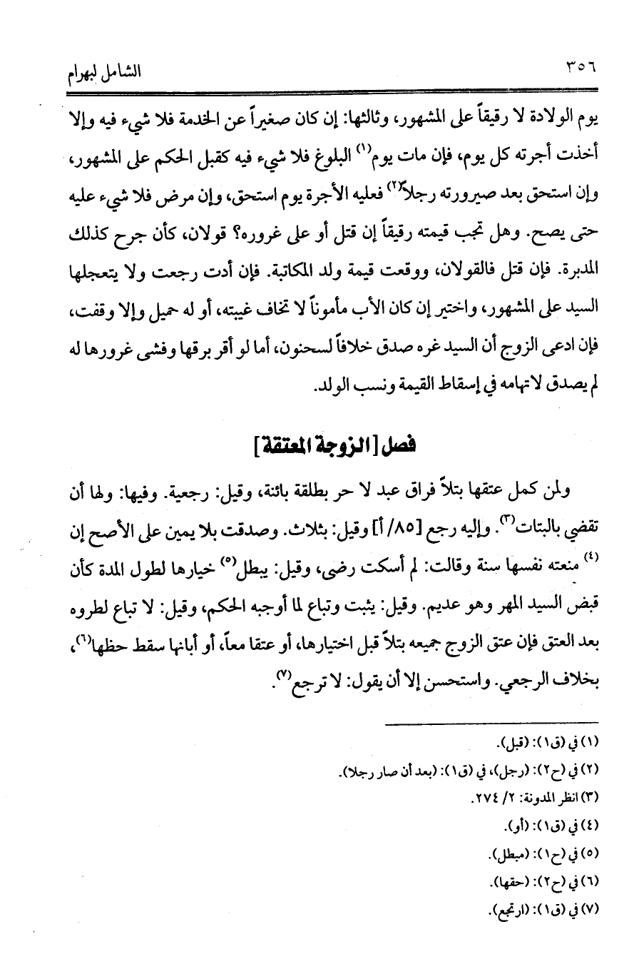 ولمن كمل عتقها بتلاً فراق عبد لا حر بطلقة بائنة، وقيل: رجعية. وفيها: ولها أن تقضي بالبتات (¬3). وإليه رجع [ب/84] وقيل: بثلاث. وصدقت بلا يمين على الأصح إن (¬4) منعته نفسها سنة وقالت: لم أسكت رضى، وقيل: يبطل (¬5) خيارها لطول المدة كأن قبض السيد المهر وهو عديم. وقيل: يثبت وتباع لما أوجبه الحكم، وقيل: لا تباع لطروه بعد العتق فإن عتق الزوج جميعه بتلاً قبل اختيارها، أو عتقا معاً، أو أبانها سقط حظها (¬6)، بخلاف الرجعي. واستحسن إلا أن يقول: لا ترجع (¬7).