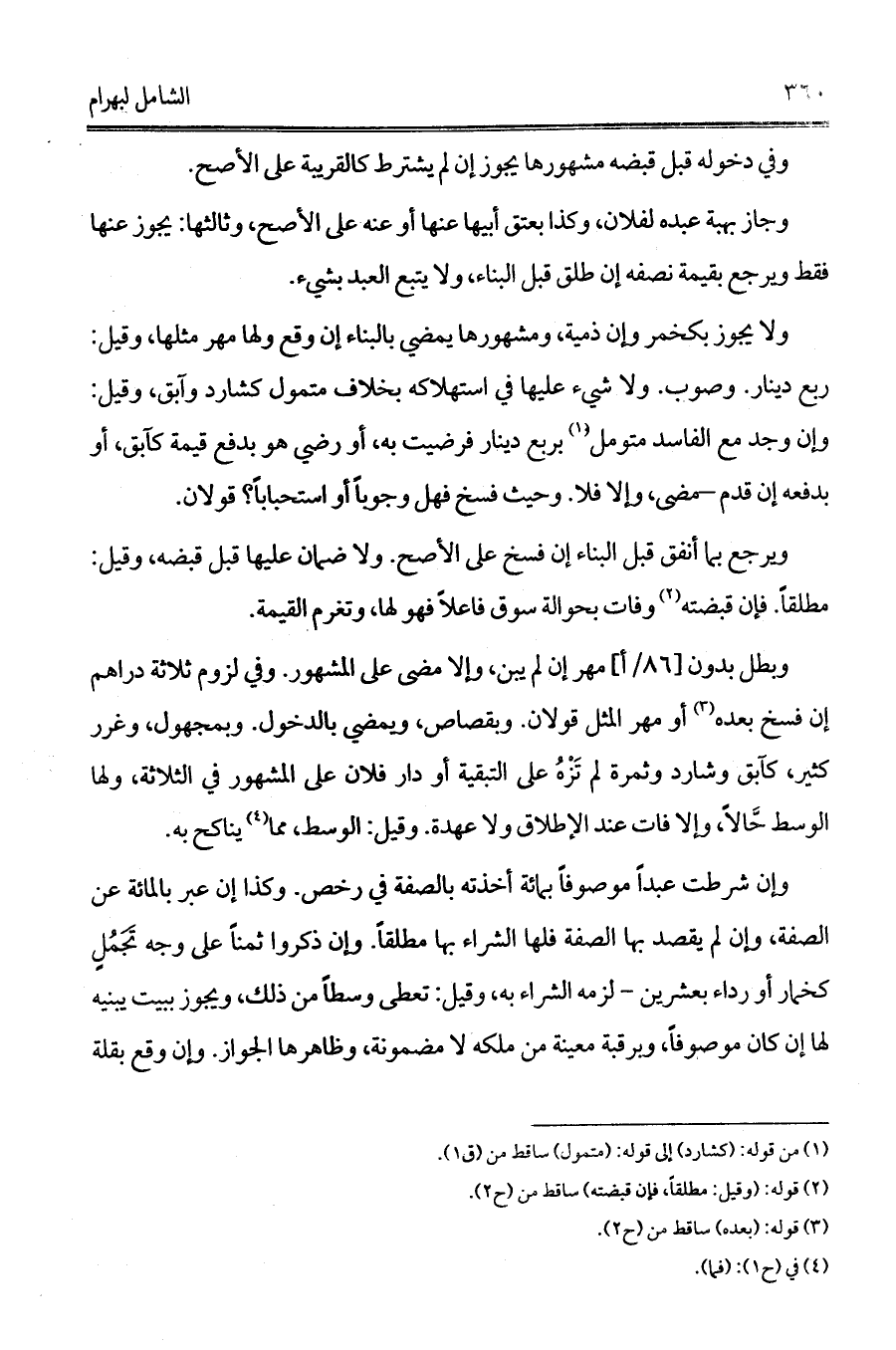وبطل بدون [ب/85] مهر إن لم يبن، وإلا مضى على المشهور. وفي لزوم ثلاثة دراهم إن فسخ بعده (¬3) أو مهر المثل قولان. وبقصاص، ويمضي بالدخول. وبمجهول، وغرر كثير، كآبق وشارد وثمرة لم تَزْهُ على التبقية أو دار فلان على المشهور في الثلاثة، ولها الوسط حَّالاً، وإلا فات عند الإطلاق ولا عهدة. وقيل: الوسط، مما (¬4) يناكح به.