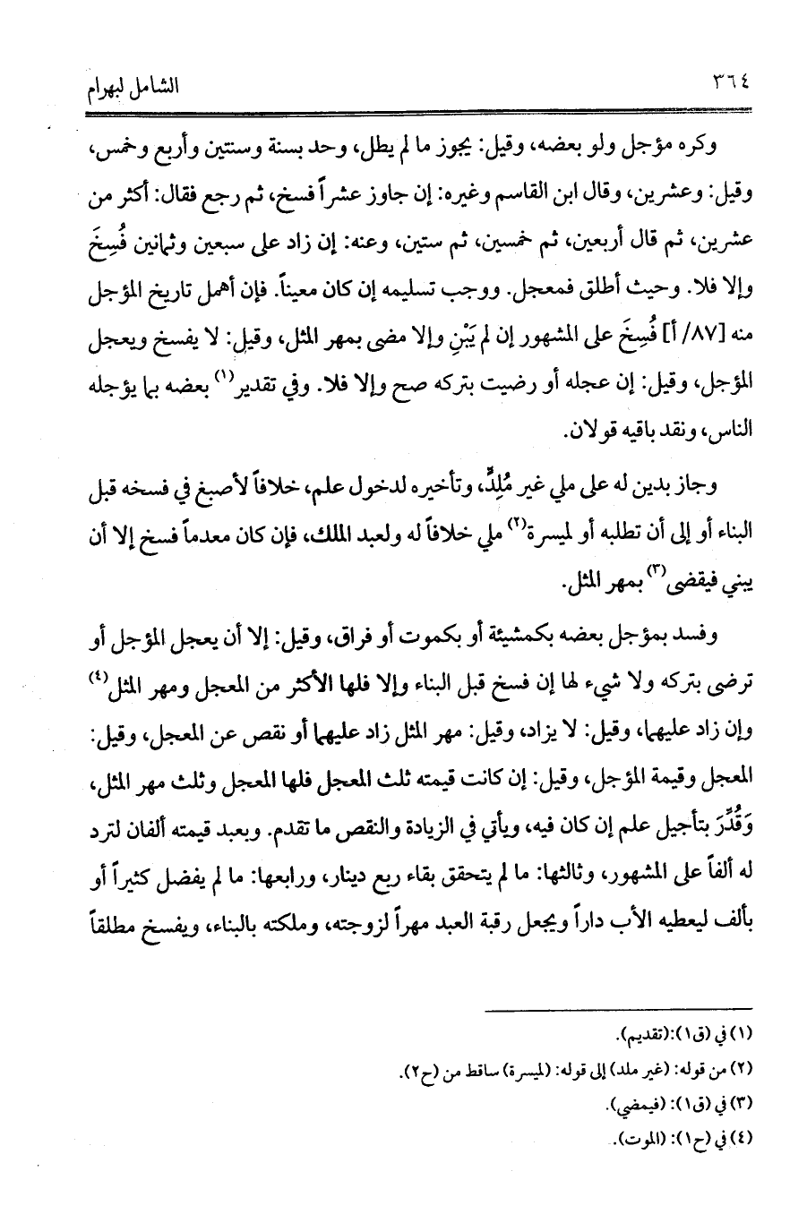 وفسد بمؤجل بعضه بكمشيئة أو بكموت أو فراق، وقيل: إلا أن يعجل المؤجل أو ترضى بتركه ولا شيء لها إن فسخ قبل البناء وإلا فلها الأكثر من المعجل ومهر المثل (¬4) وإن زاد عليهما، وقيل: لا يزاد، وقيل: مهر المثل زاد عليهما أو نقص عن المعجل، وقيل: المعجل وقيمة المؤجل، وقيل: إن كانت قيمته ثلث المعجل فلها المعجل وثلث مهر المثل، وَقُدِّرَ بتأجيل علم إن كان فيه، ويأتي في الزيادة والنقص ما تقدم. وبعبد قيمته ألفان لترد له ألفاً على المشهور، وثالثها: ما لم يتحقق بقاء ربع دينار، ورابعها: ما لم يفضل كثيراً أو بألف ليعطيه الأب داراً ويجعل رقبة العبد مهراً لزوجته، وملكته بالبناء، ويفسخ مطلقاً