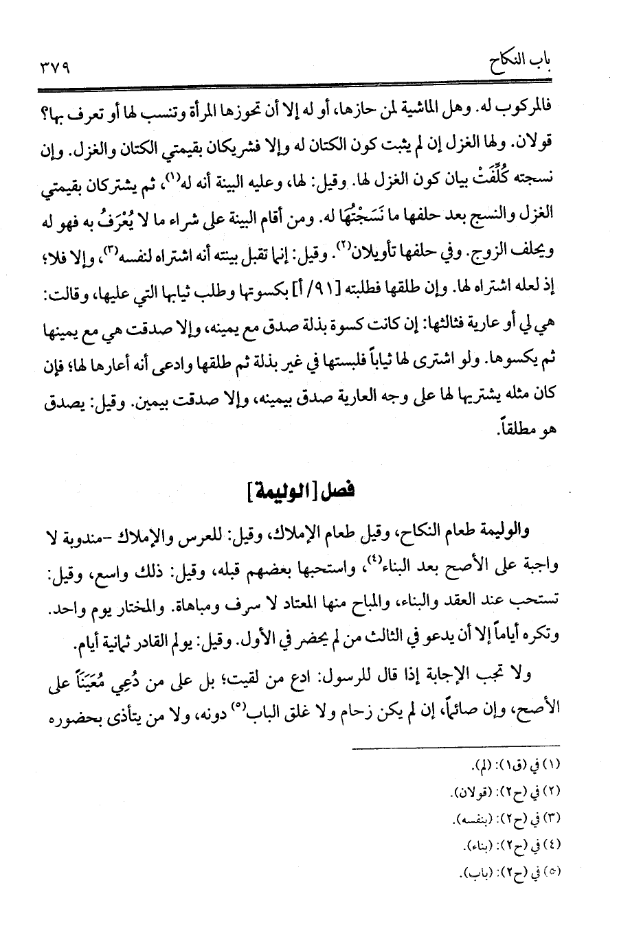 والوليمة طعام النكاح، وقيل طعام الإملاك، وقيل: للعرس والإملاك -مندوبة لا واجبة على الأصح بعد البناء (¬4)، واستحبها بعضهم قبله، وقيل: ذلك واسع، وقيل: تستحب عند العقد والبناء، والمباح منها المعتاد لا سرف ومباهاة. والمختار يوم واحد. وتكره أياماً إلا أن يدعو في الثالث من لم يحضر في الأول. وقيل: يولم القادر ثمانية أيام.