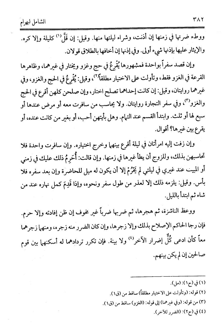 وإن زفت إليه امرأتان في ليلة أقرع بينهما وخرج اختياره. وإن سافرت واحدة فلا تحاسبهن بذلك، وللزوج أن يطأ غيرها في زمنها. وإن قالت: أُحَرِمُ ذلك عليك في زمني أو المبيت عند غيري في ليلتي لم يَحْرُمْ إلا أن يكون له ميل للحاضرة وإن بعد سفره فلا بأس. وقيل: يلزمه ذلك إلا لعذر من طول سفر ونحوه, وإذا قَدِمَ كمل نهاره عند من شاء ثم ابتدأ بالليل.