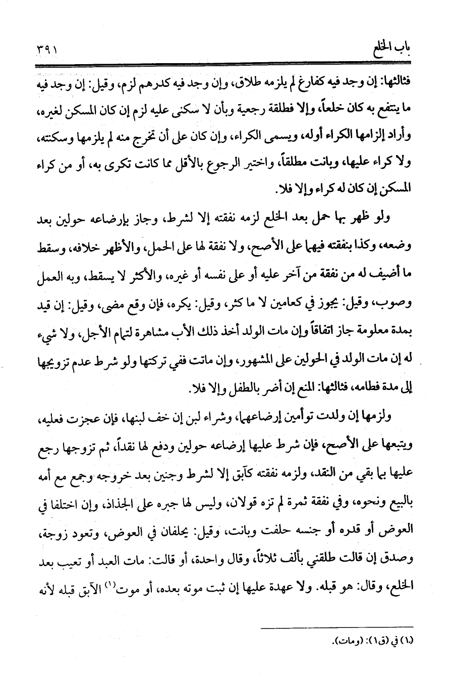 ولزمها إن ولدت توأمين إرضاعهما، وشراء لبن إن خف لبنها، فإن عجزت فعليه، ويتبعها على الأصح، فإن شرط عليها إرضاعه حولين ودفع لها نقداً، ثم تزوجها رجع عليها بما بقي من النقد، ولزمه نفقته كآبق إلا لشرط وجنين بعد خروجه وجمع مع أمه بالبيع ونحوه، وفي نفقة ثمرة لم تزه قولان، وليس لها جبره على الجذاذ، وإن اختلفا في العوض أو قدره أو جنسه حلفت وبانت، وقيل: يحلفان في العوض، وتعود زوجة، وصدق إن قالت طلقني بألف ثلاثاً، وقال واحدة، أو قالت: مات العبد أو تعيب بعد الخلع، وقال: هو قبله. ولا عهدة عليها إن ثبت موته بعده، أو موت (¬1) الآبق قبله لأنه