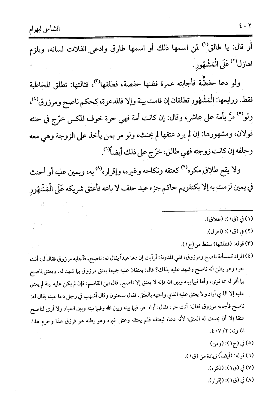 (¬4) المراد كمسألة ناصح ومرزوق، ففي المدونة: أرأيت إن دعا عبداً يقال له: ناصح، فأجابه مرزوق فقال له: أنت حر، وهو يظن أنه ناصح وشهد عليه بذلك؟ قال: يعتقان عليه جميعا يعتق مرزوق بما شهد له، ويعتق ناصح بما أقر له مما نوى، وأما فيما بينه وبين الله فإنه لا يعتق إلا ناصح. قال ابن القاسم: فإن لم يكن عليه بينة لم يعتق عليه إلا الذي أراد ولا يعتق عليه الذي واجهه بالعتق. فقال سحنون وقال أشهب في رجل دعا عبدا يقال له: ناصح فأجابه مرزوق فقال: أنت حر، فقال: أراه حرا فيما بينه وبين الله وفيما بينه وبين العباد ولا أرى لناصح عتقا إلا أن يحدث له العتق؛ لأنه دعاه ليعتقه فلم يعتقه وعتق غيره وهو يظنه هو فرزق هذا وحرم هذا. المدونة: 2/ 407.