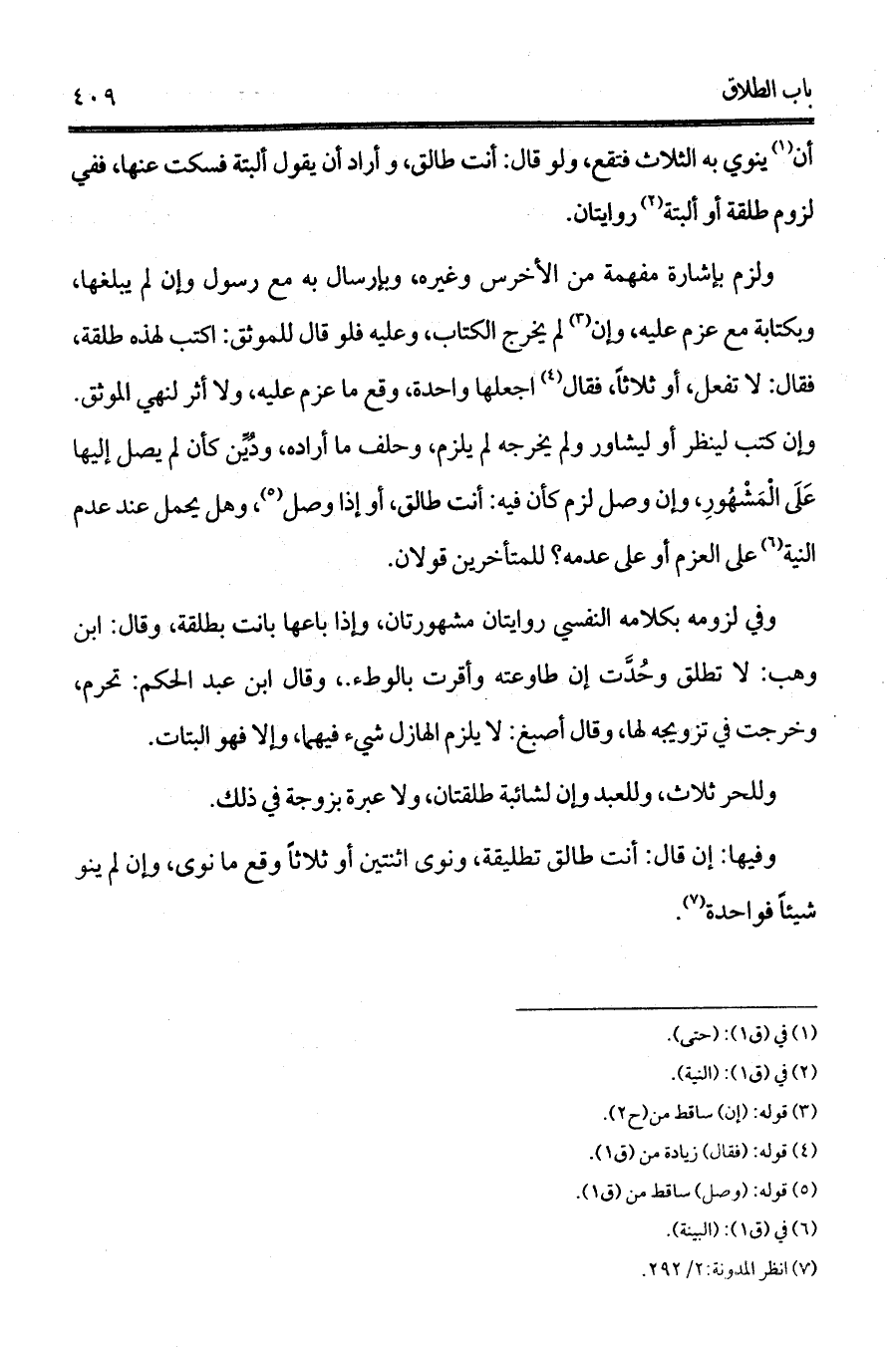 وفيها: إن قال: أنت طالق تطليقة، ونوى اثنتين أو ثلاثاً وقع ما نوى، وإن لم ينو شيئاً فواحدة (¬7).