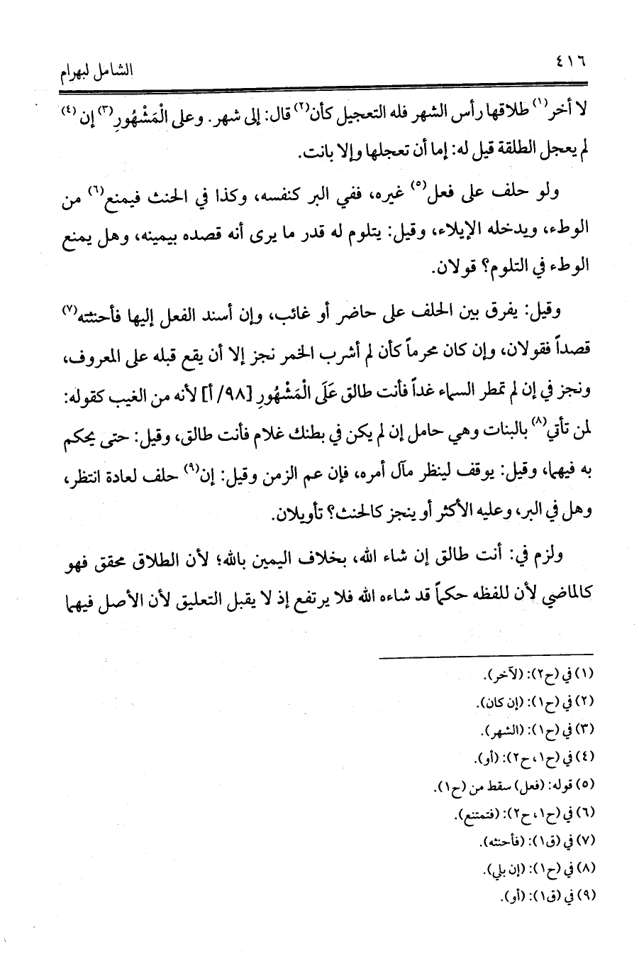 وقيل: يفرق بين الحلف على حاضر أو غائب، وإن أسند الفعل إليها فأحنثته (¬7) قصداً فقولان، وإن كان محرماً كأن لم أشرب الخمر نجز إلا أن يقع قبله على المعروف، ونجز في إن لم تمطر السماء غداً فأنت طالق عَلَى الْمَشْهُورِ [ب/97] لأنه من الغيب كقوله: لمن تأتي (¬8) بالبنات وهي حامل إن لم يكن في بطنك غلام فأنت طالق، وقيل: حتى يحكم به فيهما، وقيل: يوقف لينظر مآل أمره، فإن عم الزمن وقيل: إن (¬9) حلف لعادة انتظر، وهل في البر، وعليه الأكثر أو ينجز كالحنث؟ تأويلان.