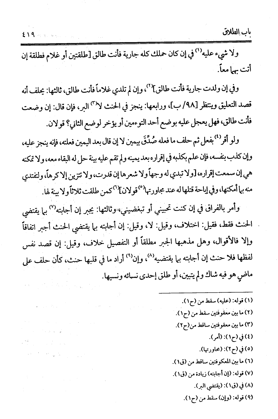 وأمر بالفراق في إن كنت تحبيني أو تبغضيني، وثالثها: يجبر إن أجابته (¬7) بما يقتضي الحنث فقط، فقيل: اختلاف، وقيل: لا، وقيل: إن أجابته بما يقتضي الحنث أجبر اتفاقاً وإلا فالأقوال، وهل مذهبها الجبر مطلقاً أو التفصيل خلاف، وقيل: إن قصد نفس لفظها فلا حنث إن أجابته بما يقتضيه (¬8)، وإن (¬9) أراد ما في قلبها حنث، كأن حلف على ماضٍ هو فيه شاك ولم يتبين، أو طلق إحدى نسائه ونسيها.